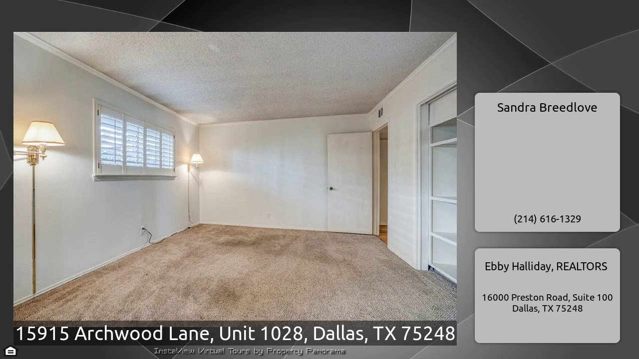 The Virtual Tour for the property at 15915 Archwood Lane, Unit 1028, Dallas, TX 75248 listed for $188,500: Other homes for sale by Sandra Breedlove of Ebby Halliday, REALTORS: Great complex located at entrance to Prestonwood Country Club! Ground floor unit & all on one level! Spacious unit has fresh paint & carpet replaced in both bedrooms. Living room has fireplace with gas starter! Kitchen has white painted cabinets, breakfast bar & solid surface neutral countertops! Wood-look laminate flooring in kitchen, dining & hallway! Washer & dryer are located inside the unit! French doors from …