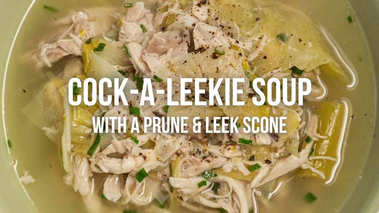 Full Recipe: https://everydaygourmet.tv/recipes/cock-a-leekie-soup-with-a-prune-leek-scone