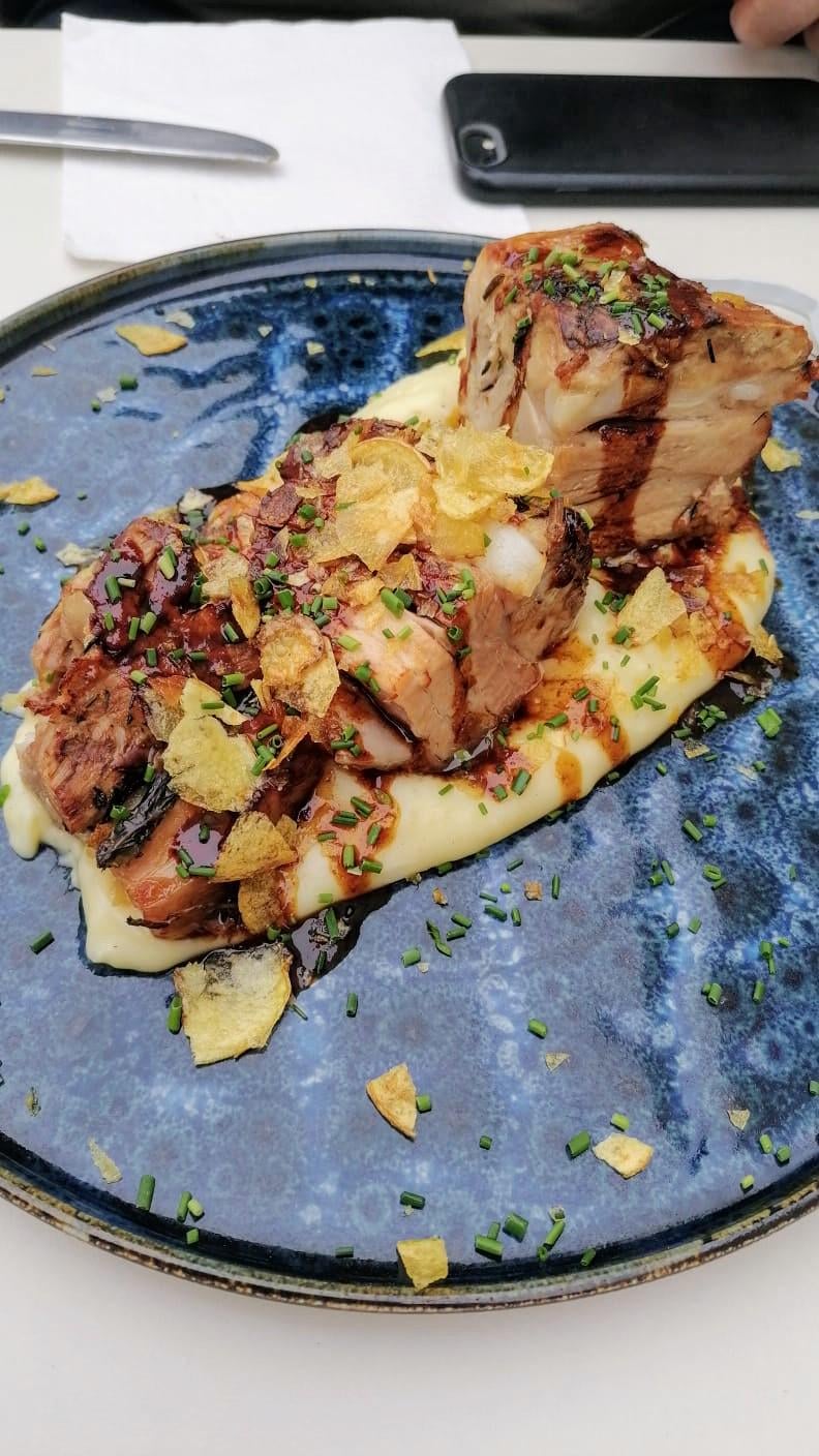 Pork Belly with apple cider gravy on mashed Potatoes