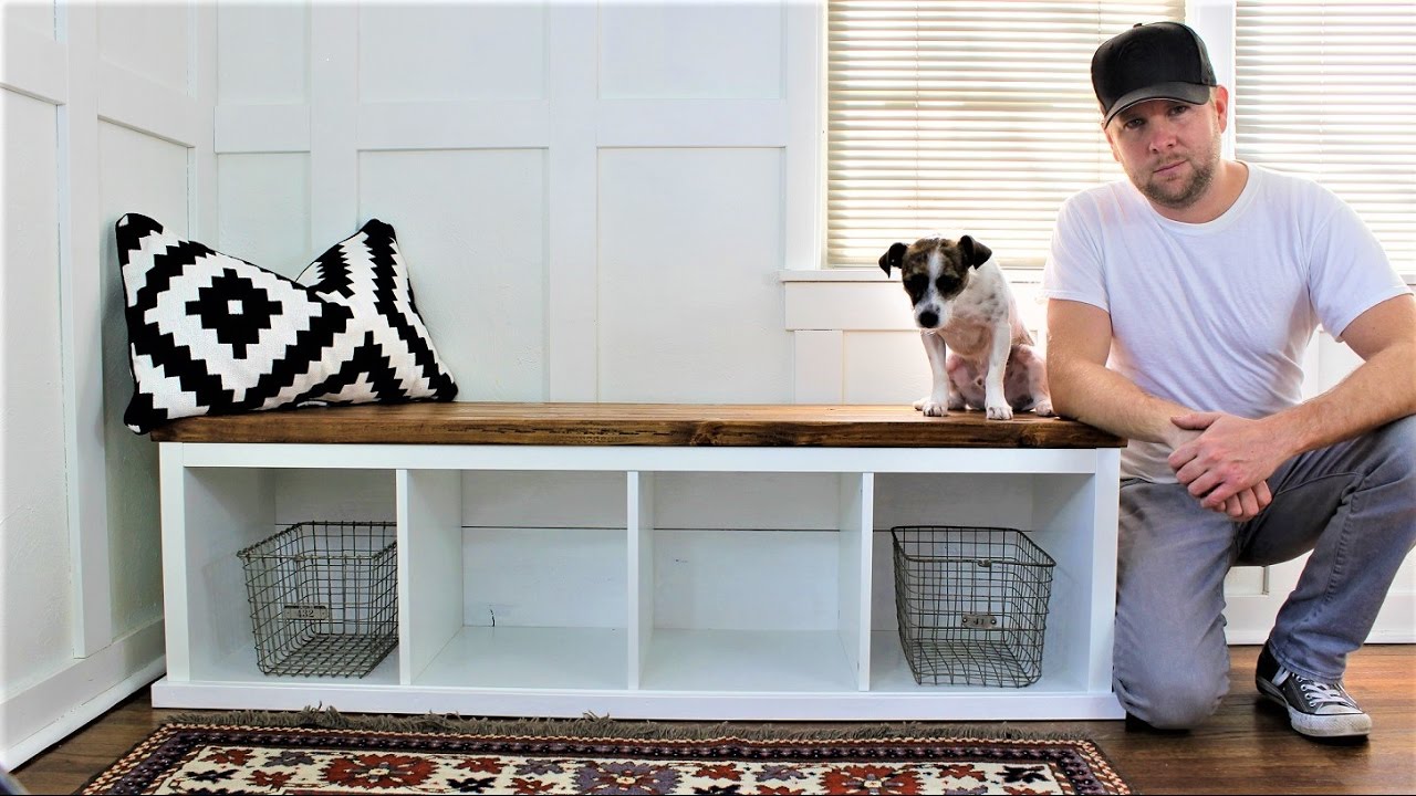 Easy DIY tutorial for turning an Ikea shelving unit into a shiplap storage bench!