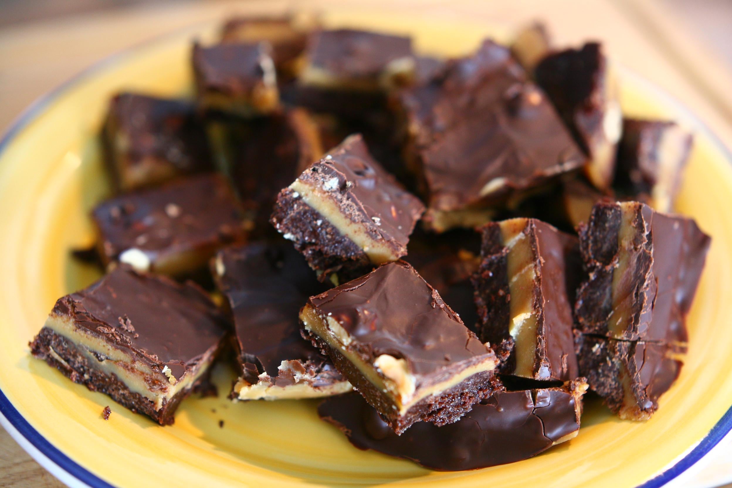 In a medium-sized saucepan and over a medium heat, melt the butter and then add the condensed milk, golden syrup and sugar. Turn the heat to low and stir continuously for 12-15 mins until the mixture is dark caramel in colour – do not let it burn. Remove from the heat and stir in the nuts. Spread evenly over the chocolate base and allow to cool.
