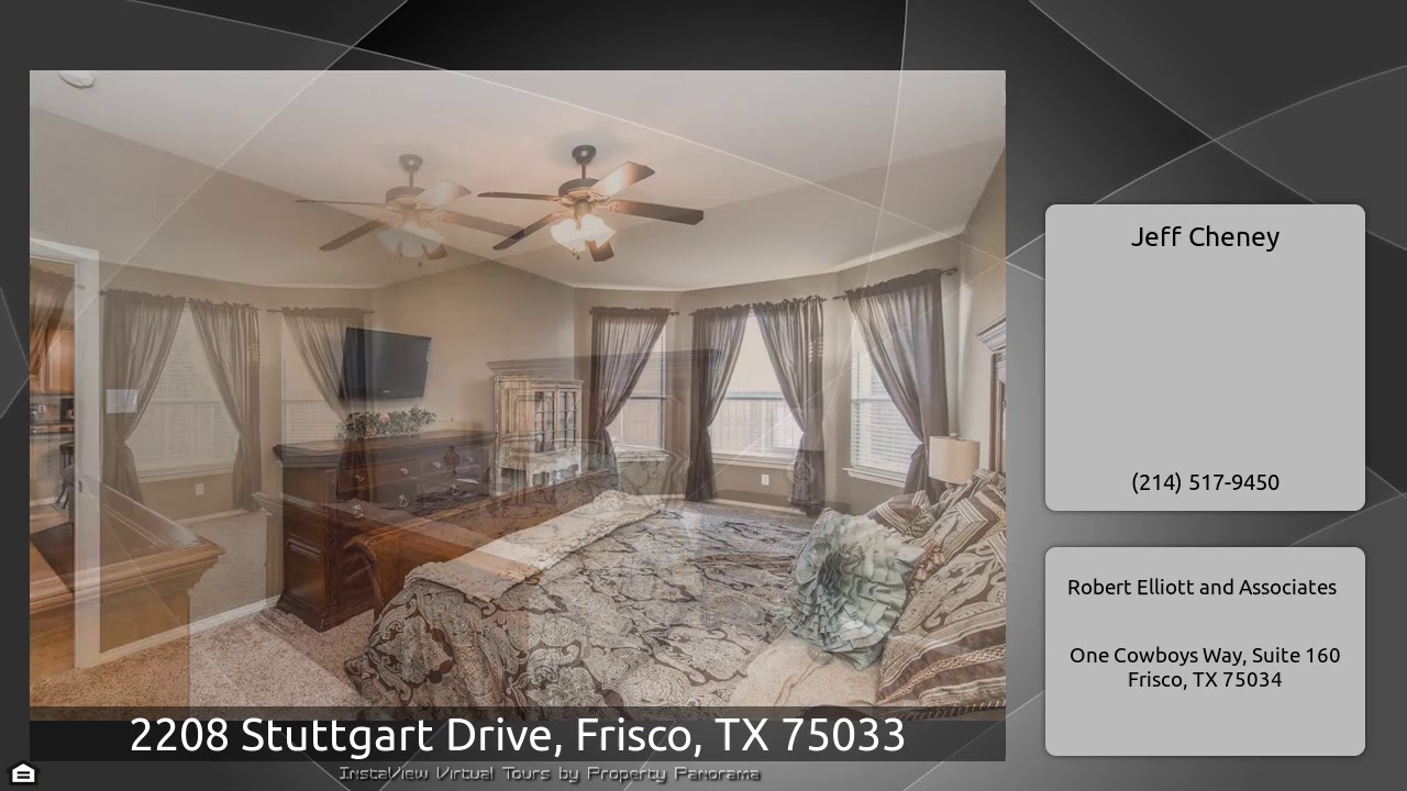 The Virtual Tour for the property at 2208 Stuttgart Drive, Frisco, TX 75033 listed for $2,350: Other homes for sale by Jeff Cheney of Robert Elliott and Associates: Beautiful home in sought after Grayhawk. Great open floor plan features 5 bedrooms, & 4 living areas. Fifth bedroom can be also used as a study- has French Doors. Formal living & dining are great for entertaining friends & family.Kitchen features large granite island, breakfast bar, plenty of cabinet and counter space. Large family opens to the kitchen boasts wood floors & a cozy fireplace. Pvt master with bay windows & walk- in …