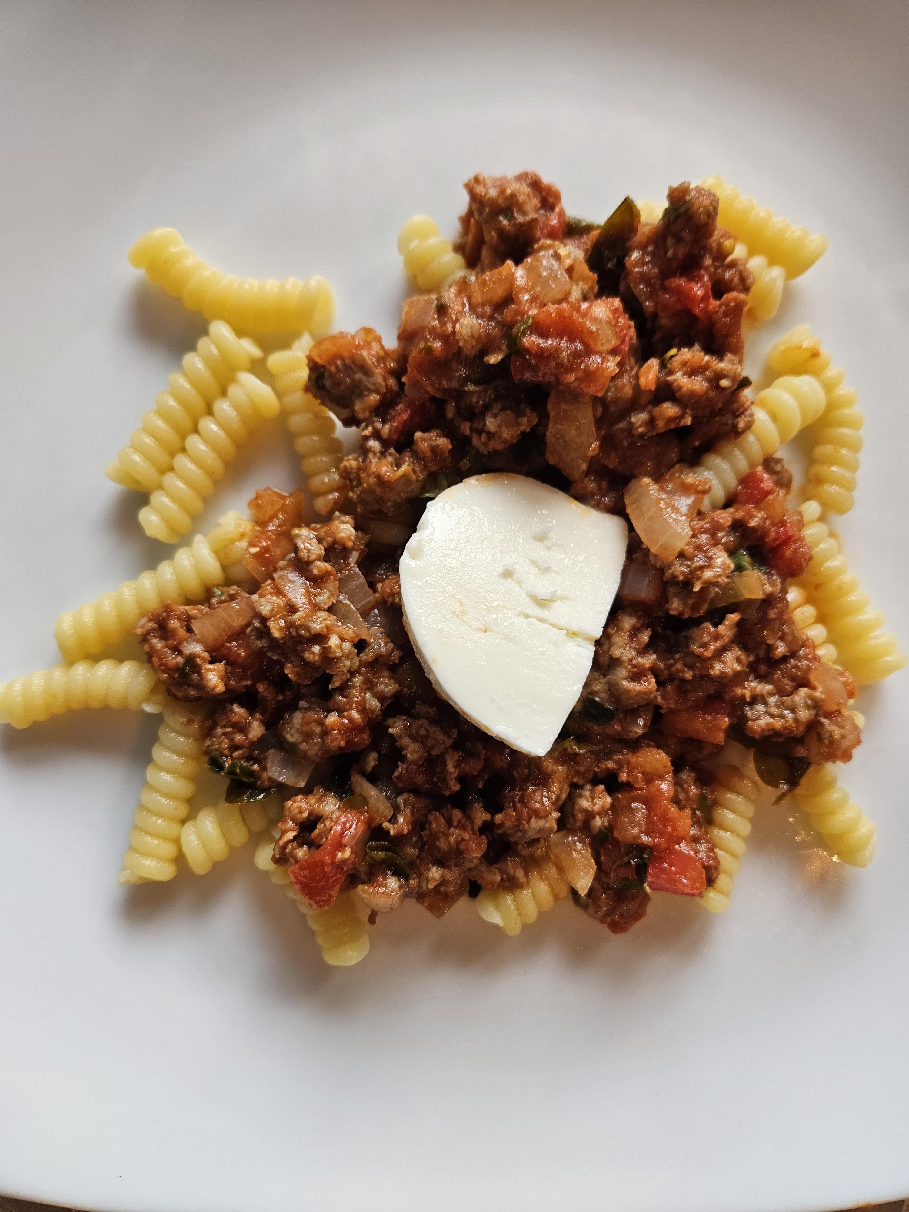 Pasta with a sauce made of veal mince, onions, garlic, homegrown basil and oregano, and homegrown tomatoes