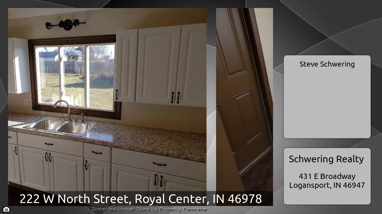 The Virtual Tour for the property at 222 W North Street, Royal Center, IN 46978 listed for $119,000: Other homes for sale by Steve Schwering of Schwering Realty: Nice big Home. 4/5 bedrooms. Completely remodeled. Brand new roof. New furnace. French doors to a large master bedroom. Large master bathroom with vaulted ceiling. All new kitchen and appliances. French doors leading into the back yard off of the spacious dining room. Pantry. Fenced in back yard.