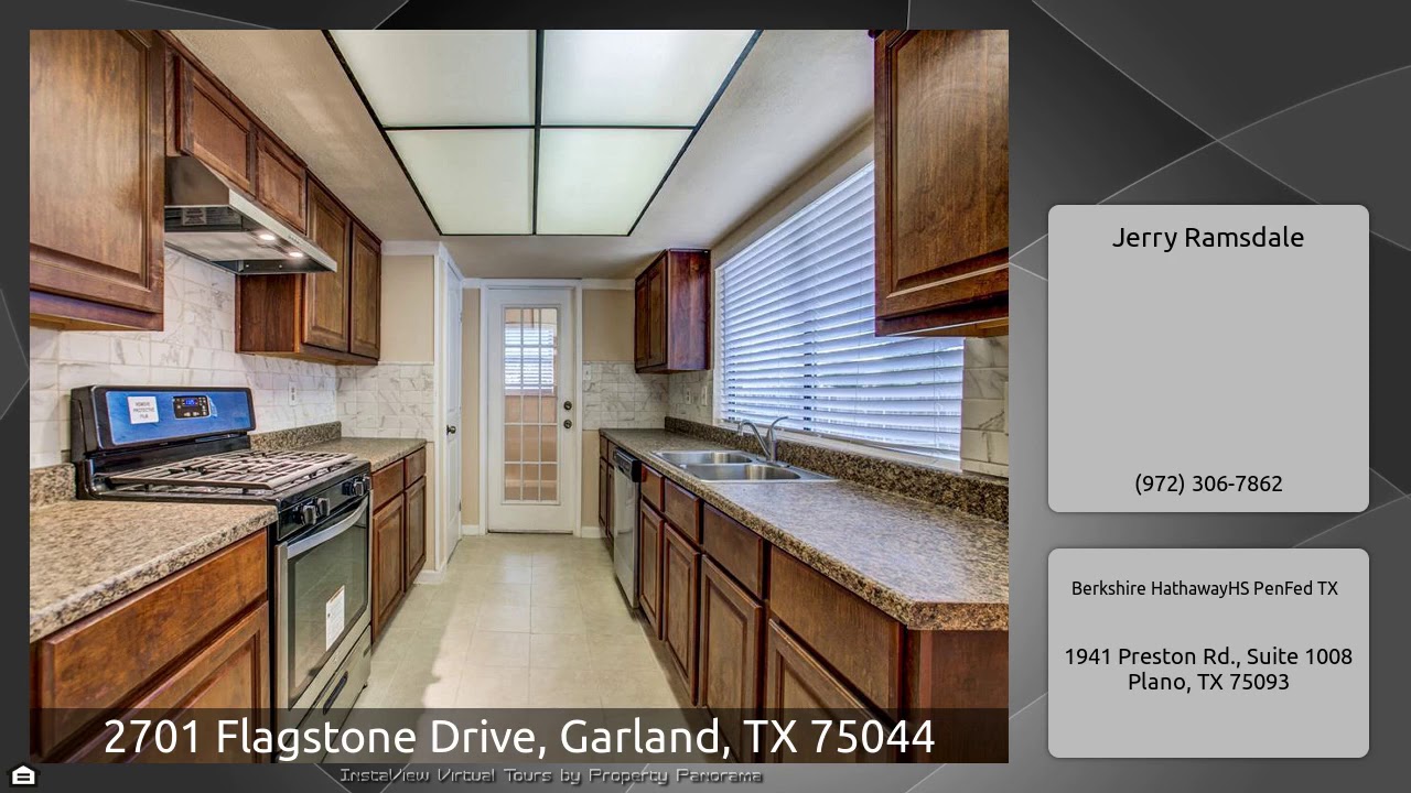 The Virtual Tour for the property at 2701 Flagstone Drive, Garland, TX 75044 listed for $229,000: Other homes for sale by Jerry Ramsdale of Berkshire HathawayHS PenFed TX: Nice mid-century ranch, beautiful wall-to-wall renovations completed just prior to listing. High efficiency AC unit, fresh paint, Bamboo and ceramic floors with carpet in the bedrooms. Updated kitchen with gas range, 4 BR, 2 BA, 2 living areas, one with fireplace, 2 dining areas, 2 car garage. Wet bar. Big breakfast area. Double pane windows, french doors. Alley entrance for 2 car garage with opener. Nice size corner lot …