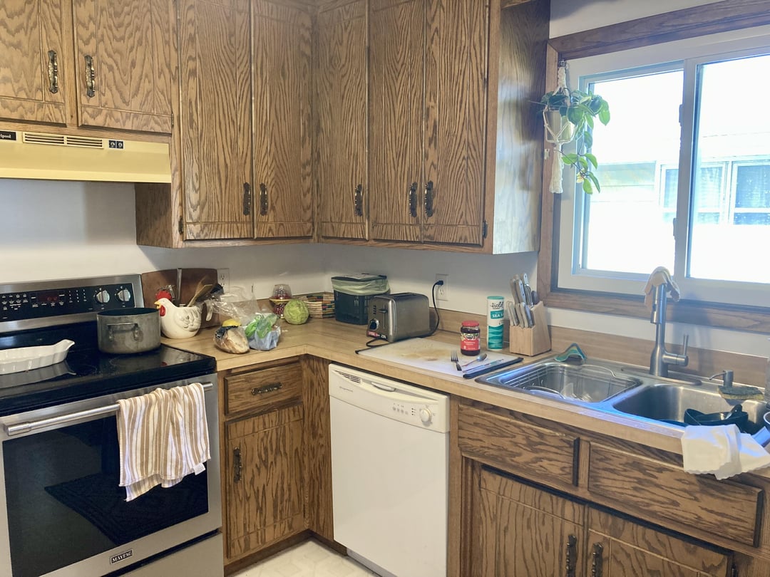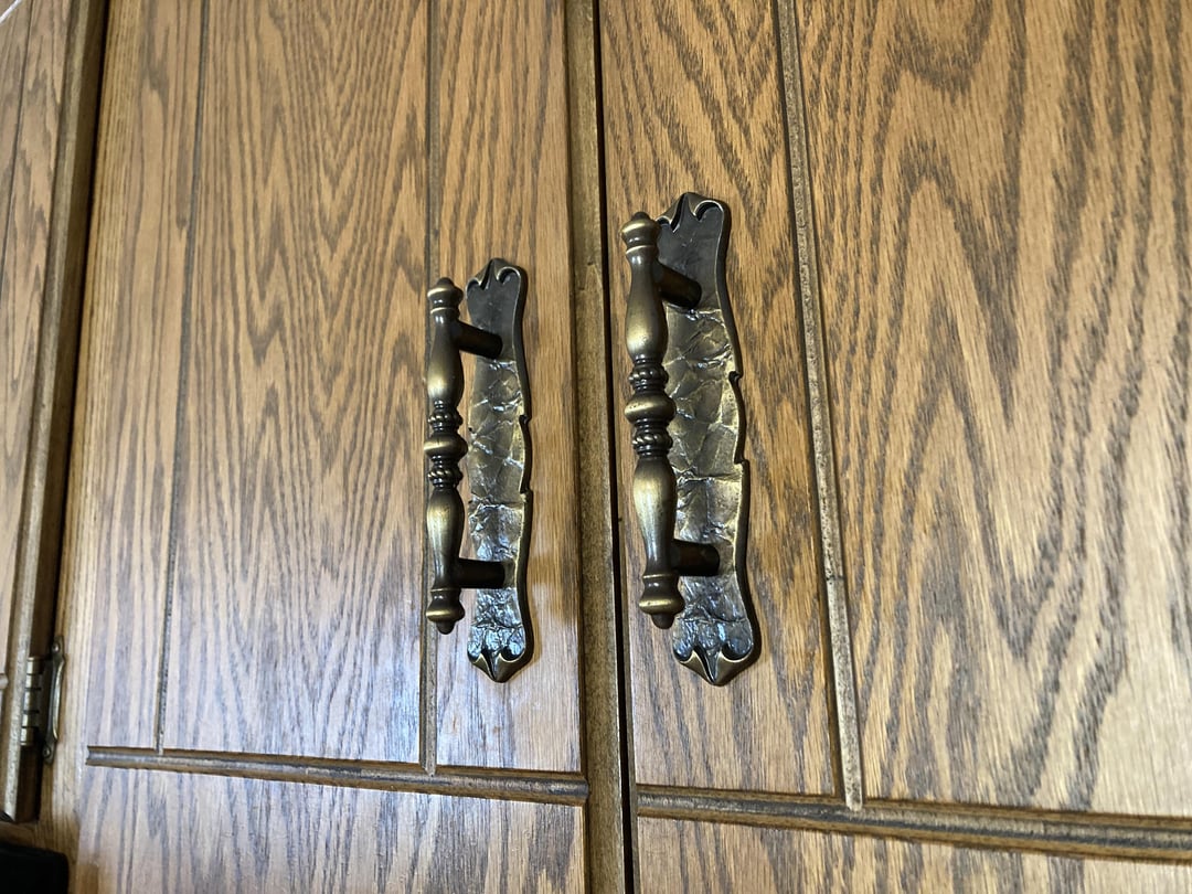 Hi all…these are original 1970s wood cabinets. I love the quality but hate the orangey-wood grain look. The knobs are also brass, so very nice, but outdated. How can I modernize our kitchen without refacing the cabinets? Black handles? Strip the handles and polish up the brass?