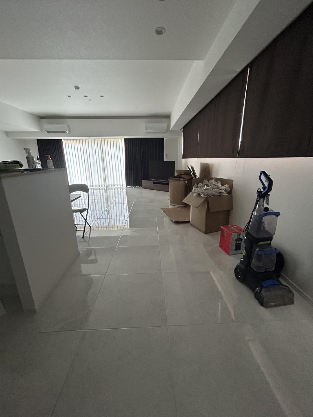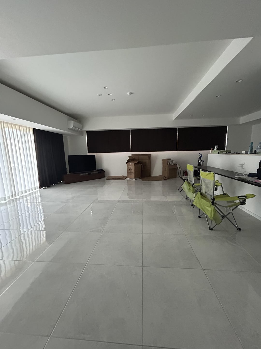 I have a living room with a low countertop and shape is hard for me to choose what kind of color I should aim for a carpet/couch/chairs/dining table. I can’t move the tv due to it being connected and don’t want to mess with it. White marble tile is hard for me since I already have dark brown curtains. What are soft and warm colors? That’s something google showed me to use with white marble tile. This place used to be an airbnb but I didn’t like how they decorated it. I can’t replace the dark brown curtains. I’m not good at this, so any help is appreciated! Thanks!