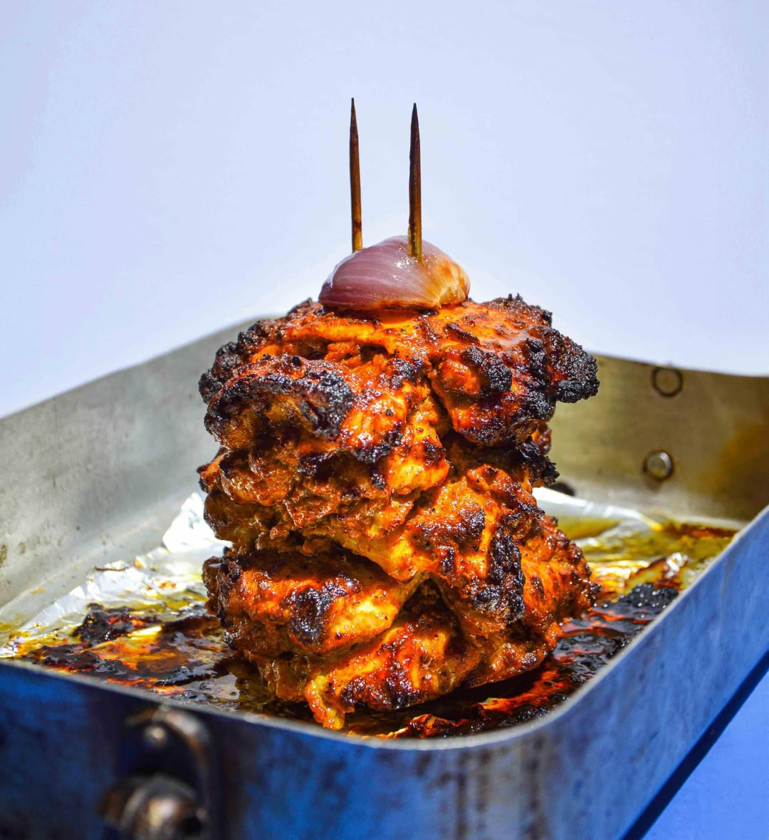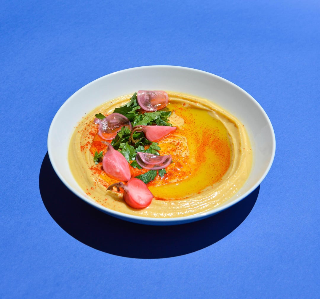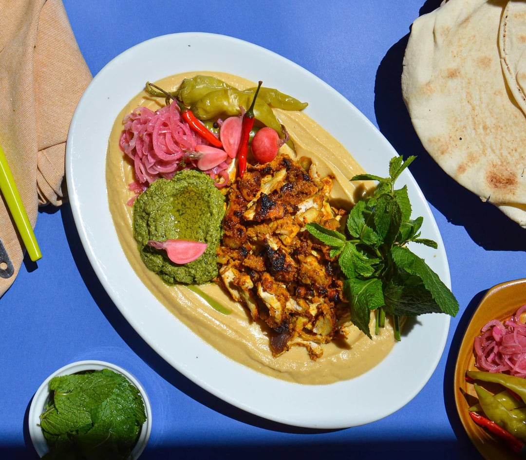 Oven roasted chicken shawarma served with hummus, radish, red onion pickles and tangy green herb sauce