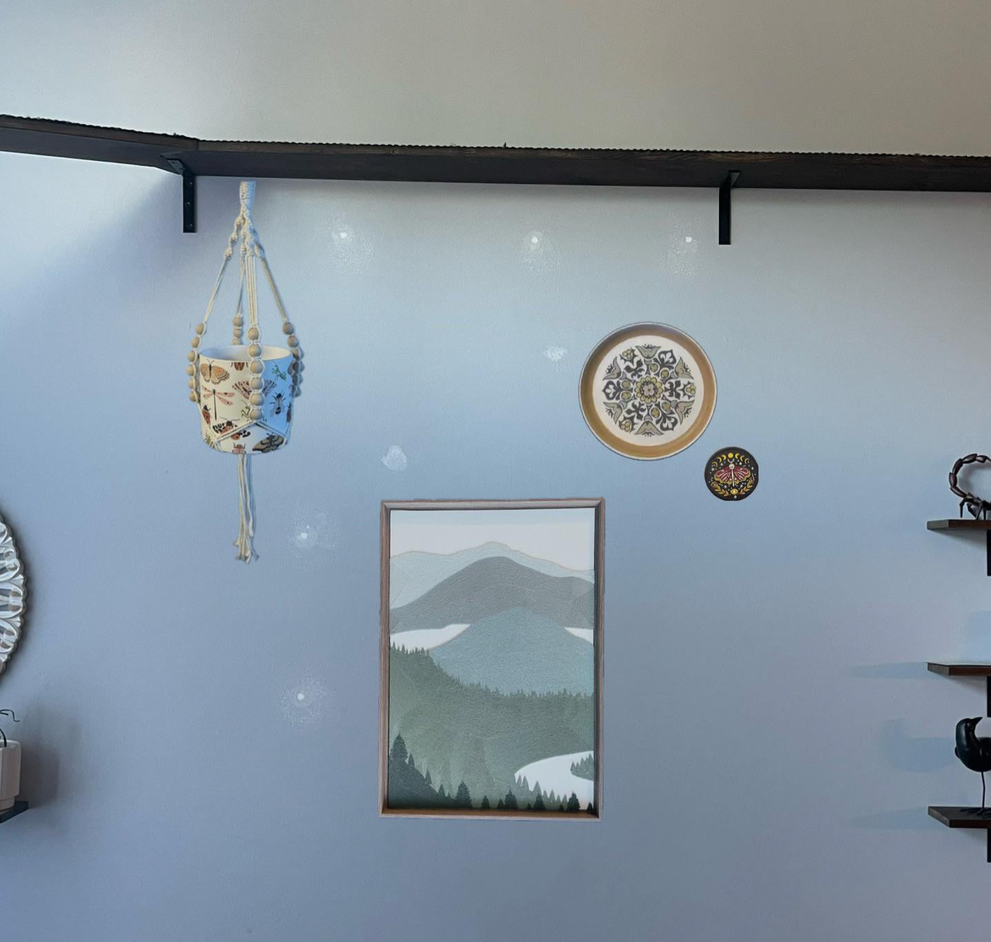 I will be adding more things to it as I find/make them. I have a pothos I propagated for the pot, and then I am wanting to showcase something from each of my creative hobbies (knitting, embroidery, water colour etc.) but before I go drilling holes in the wall I thought I would get the opinions of some internet strangers lol I think the thread painting may be a little low, but I wasn’t sure if it would look strange not lined up with the shelving I have. (My ceilings are 10’)