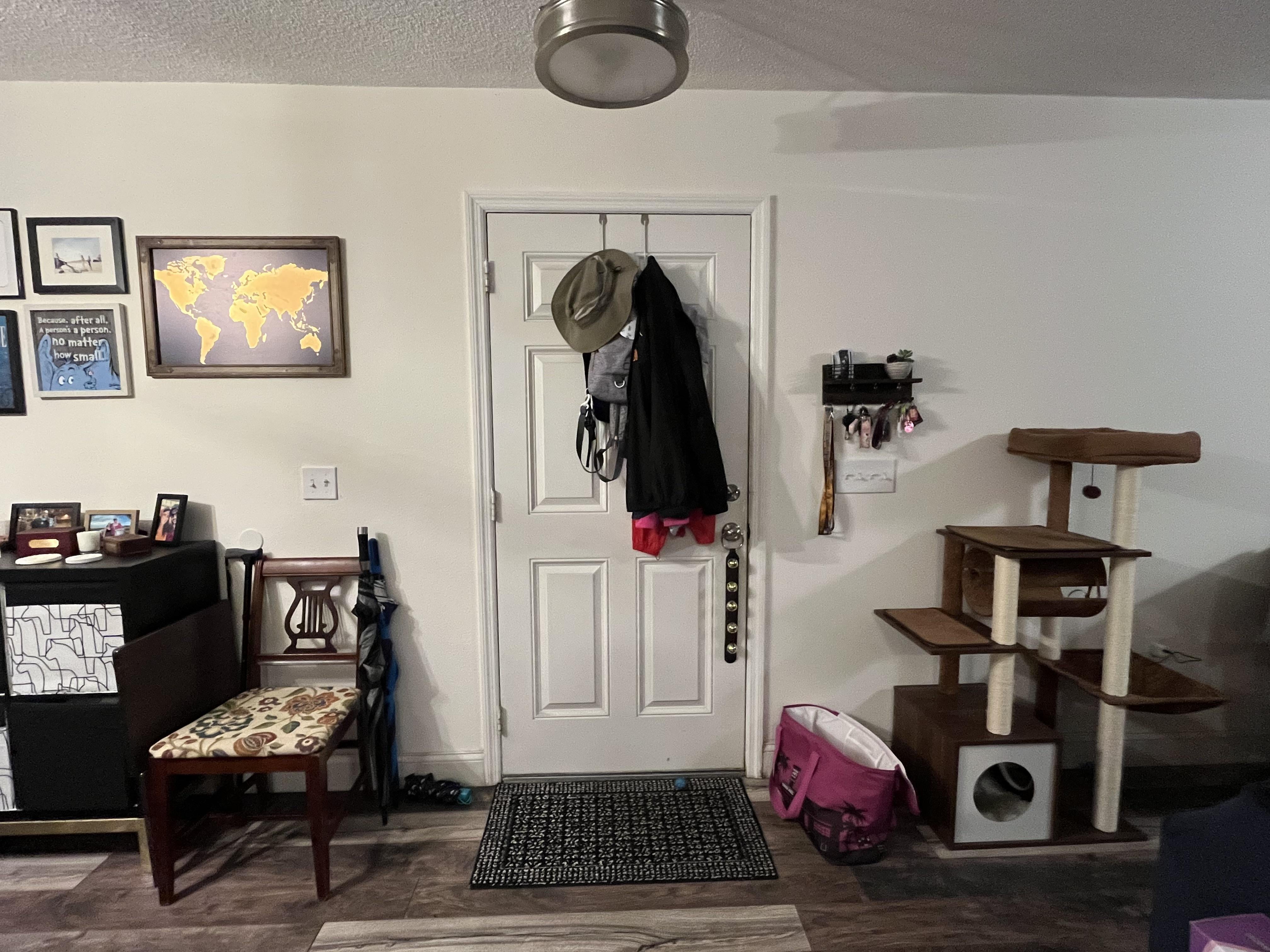 I’m looking for any storage or organization solutions for a “drop zone” (no closets downstairs) for coats/shoes/bags/etc. This is the wall space near the door – it’s one big space our living room is on one side and the dining room on the other side of the door. I hate clutter, so it’s been driving me nuts having that stuff seemingly everywhere.