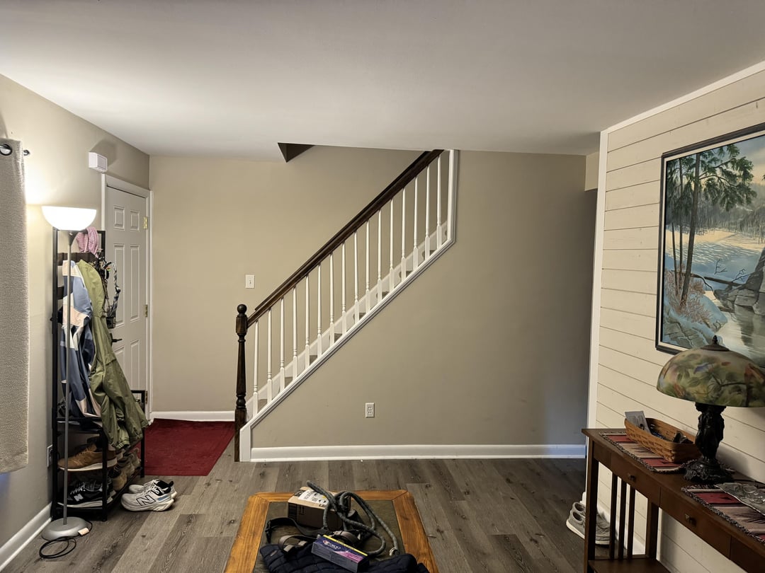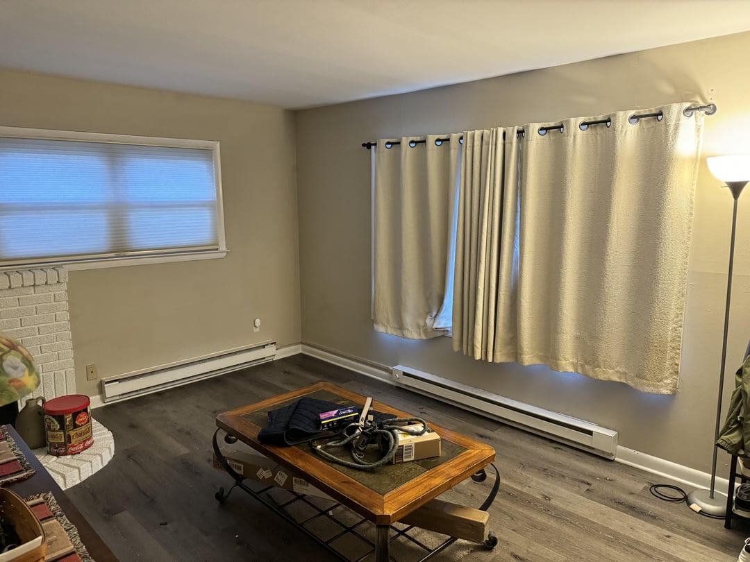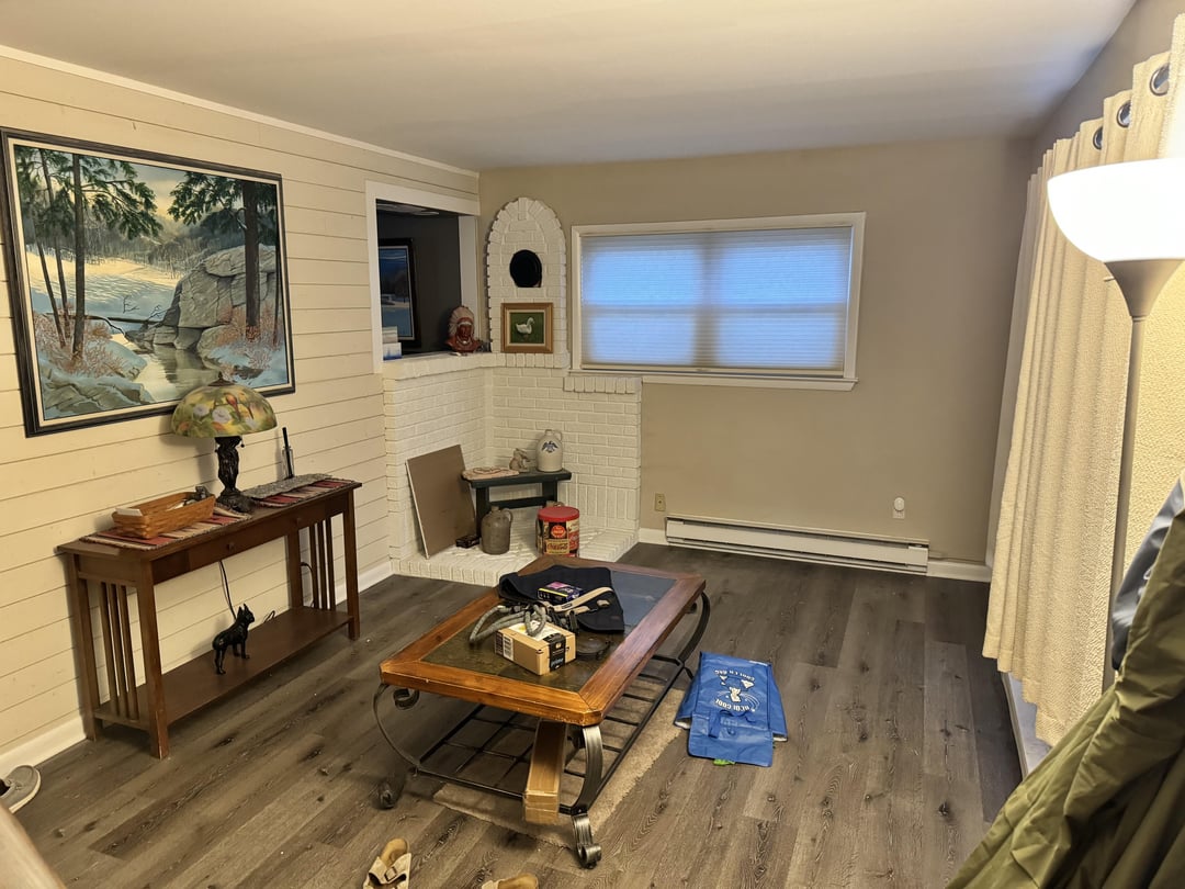 This is the first room right when you walk into my house. I clearly have no idea what to do. The white brick is a hearth for a wood burning stove that was taken out before I bought the house. The brick was also painted before I bought the house.