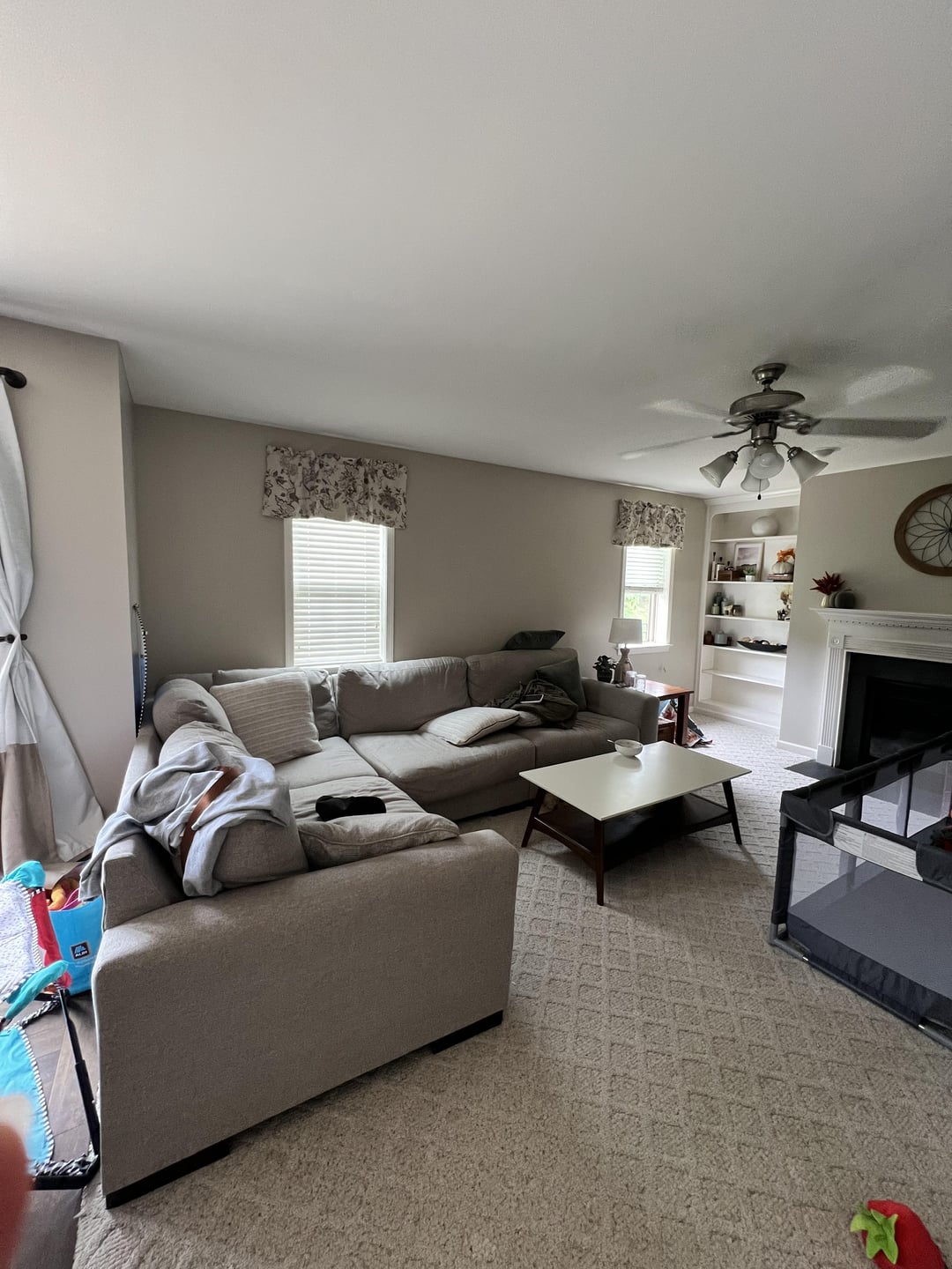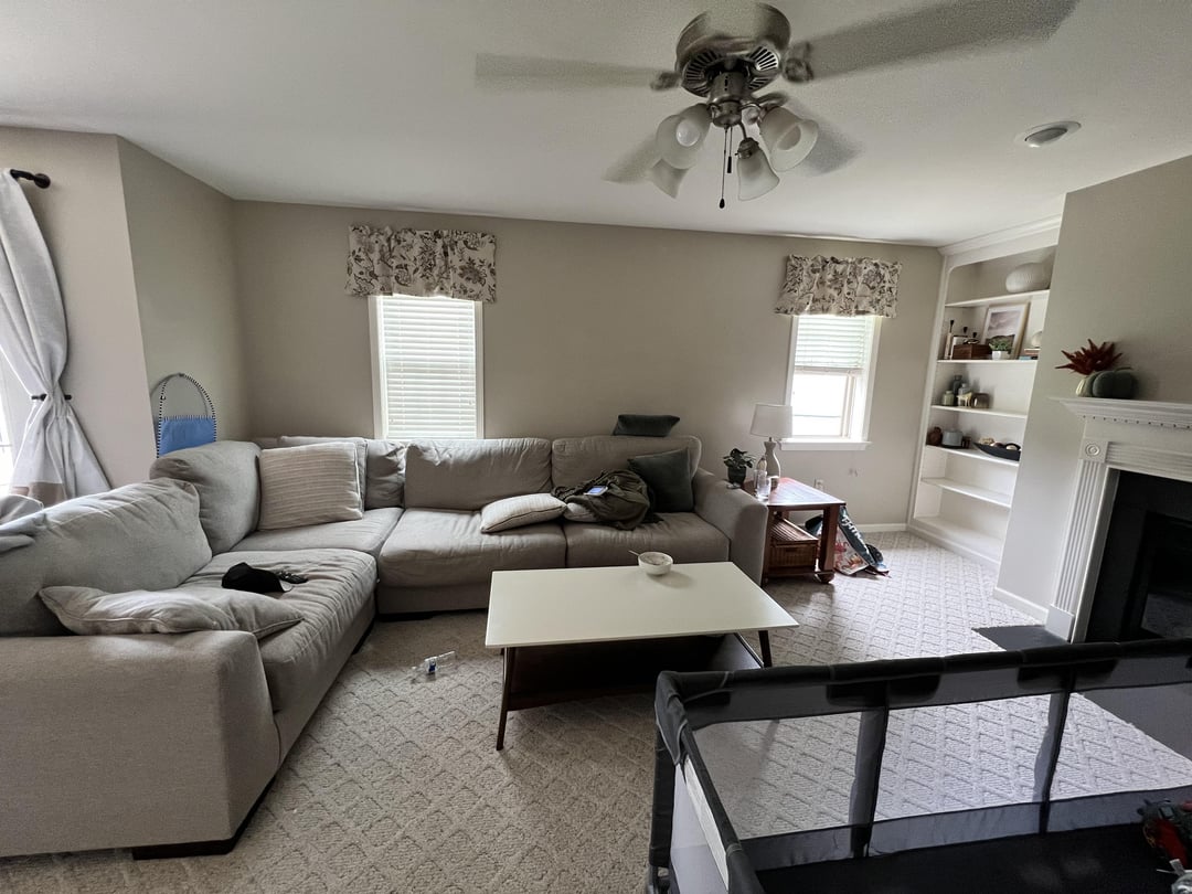 My living room is driving me crazy. I want to add color and texture to create visual interest. Every time I try, it just misses. The windows and floor vents behind the couch and wall vents on the TV wall make it difficult to identify how to center the furniture. I really like organic modern with traditional/transitional touches