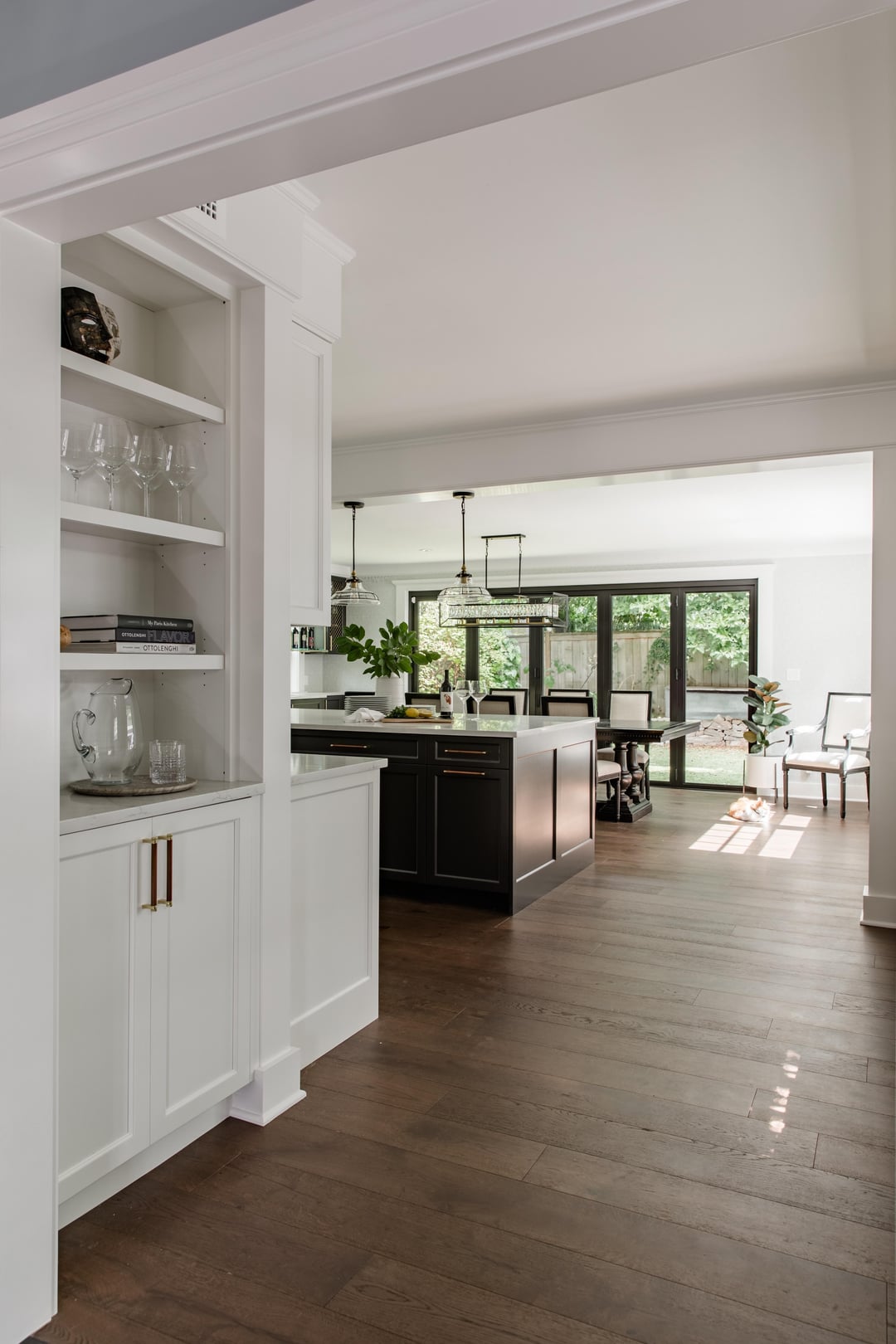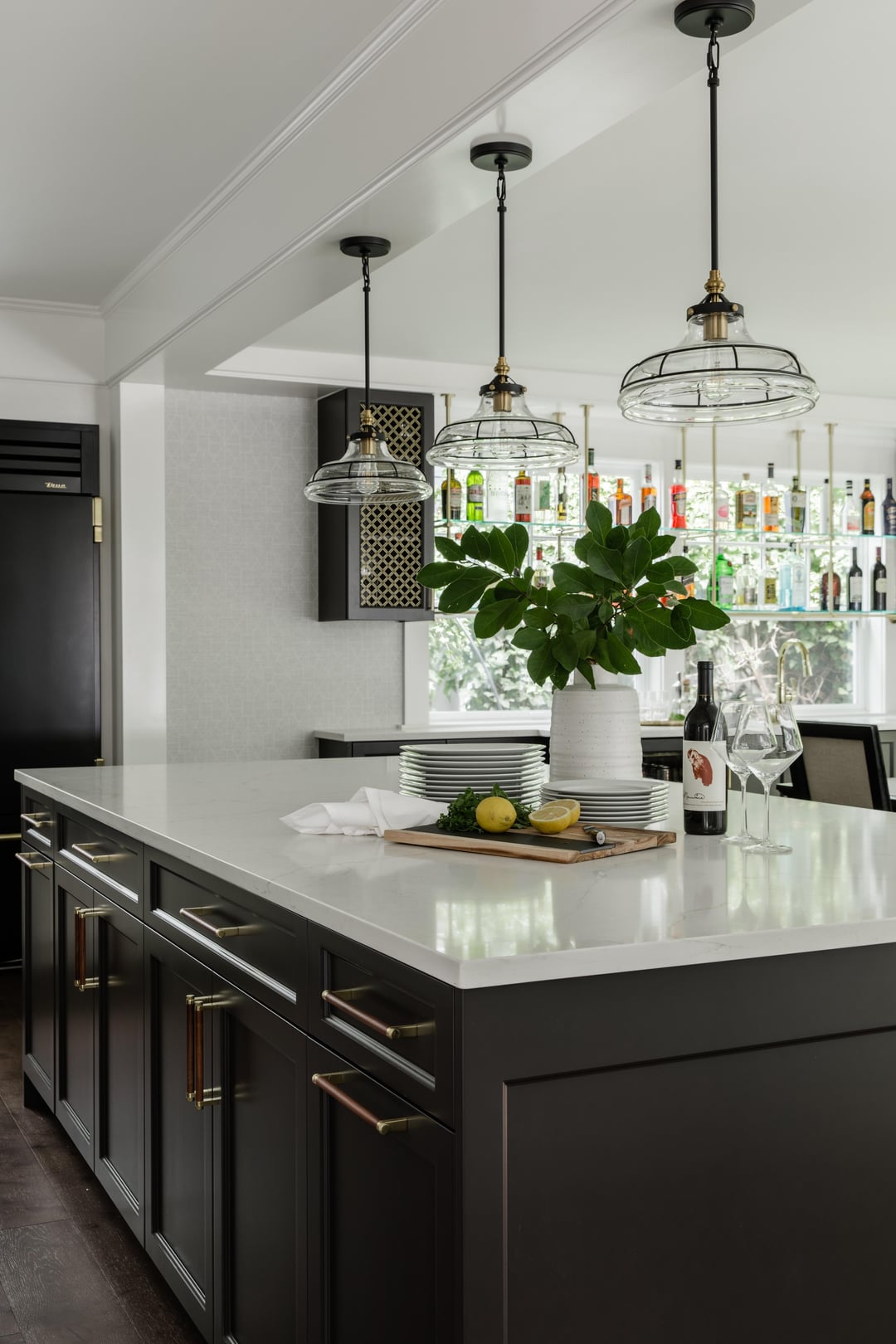 The pendant lights above the island are beautiful