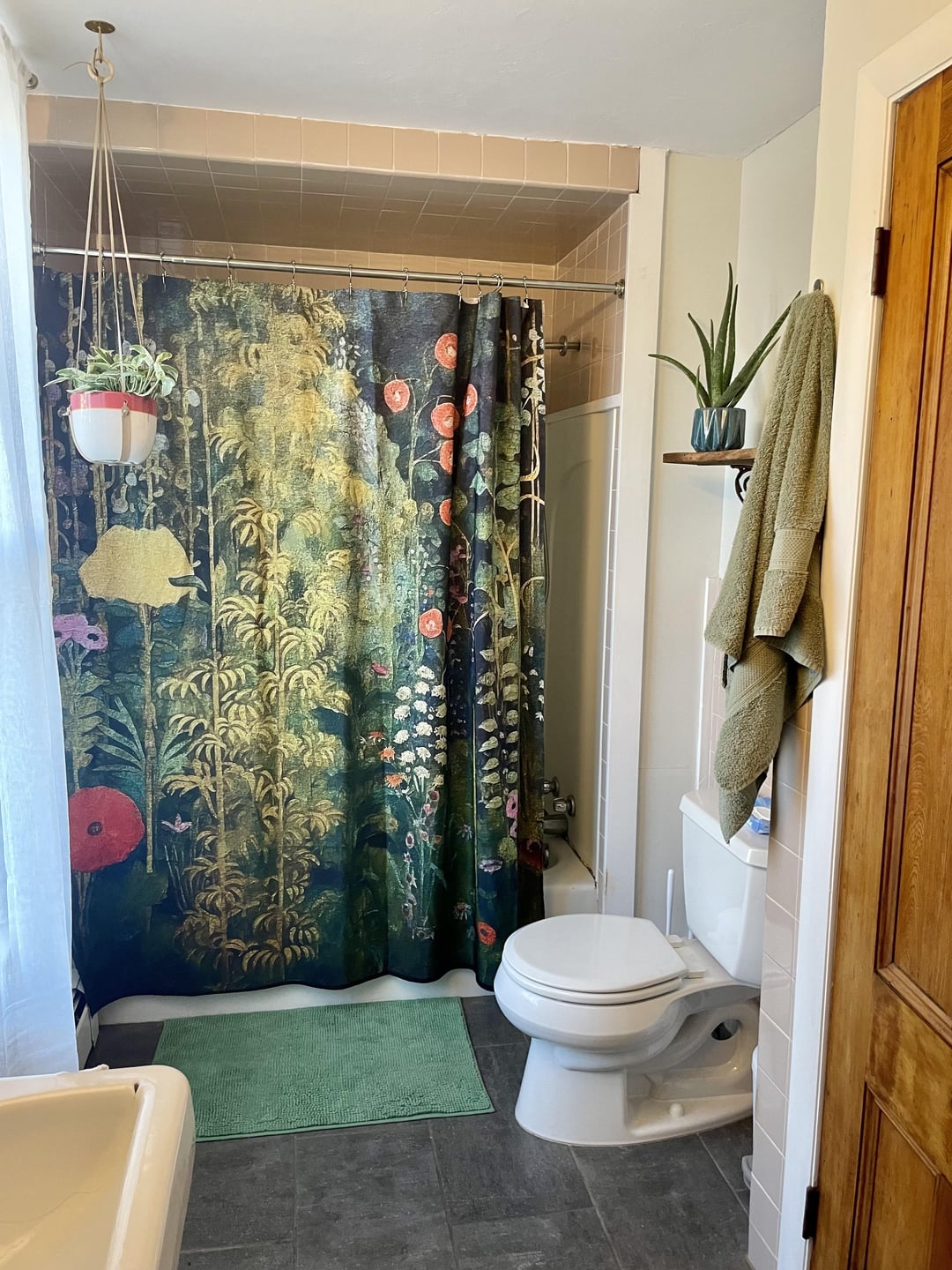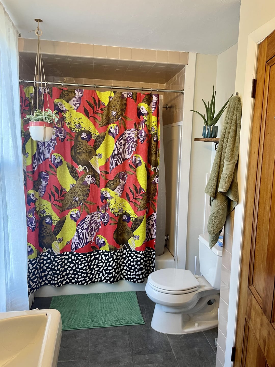 The first one is something I got at a yard sale years ago and never thought I’d use, but I kinda love how fun it is. Only problem is that those aren’t really my colors and don’t do anything to show off the pink tile. Second one I just got and I love it equally as much. Please help!