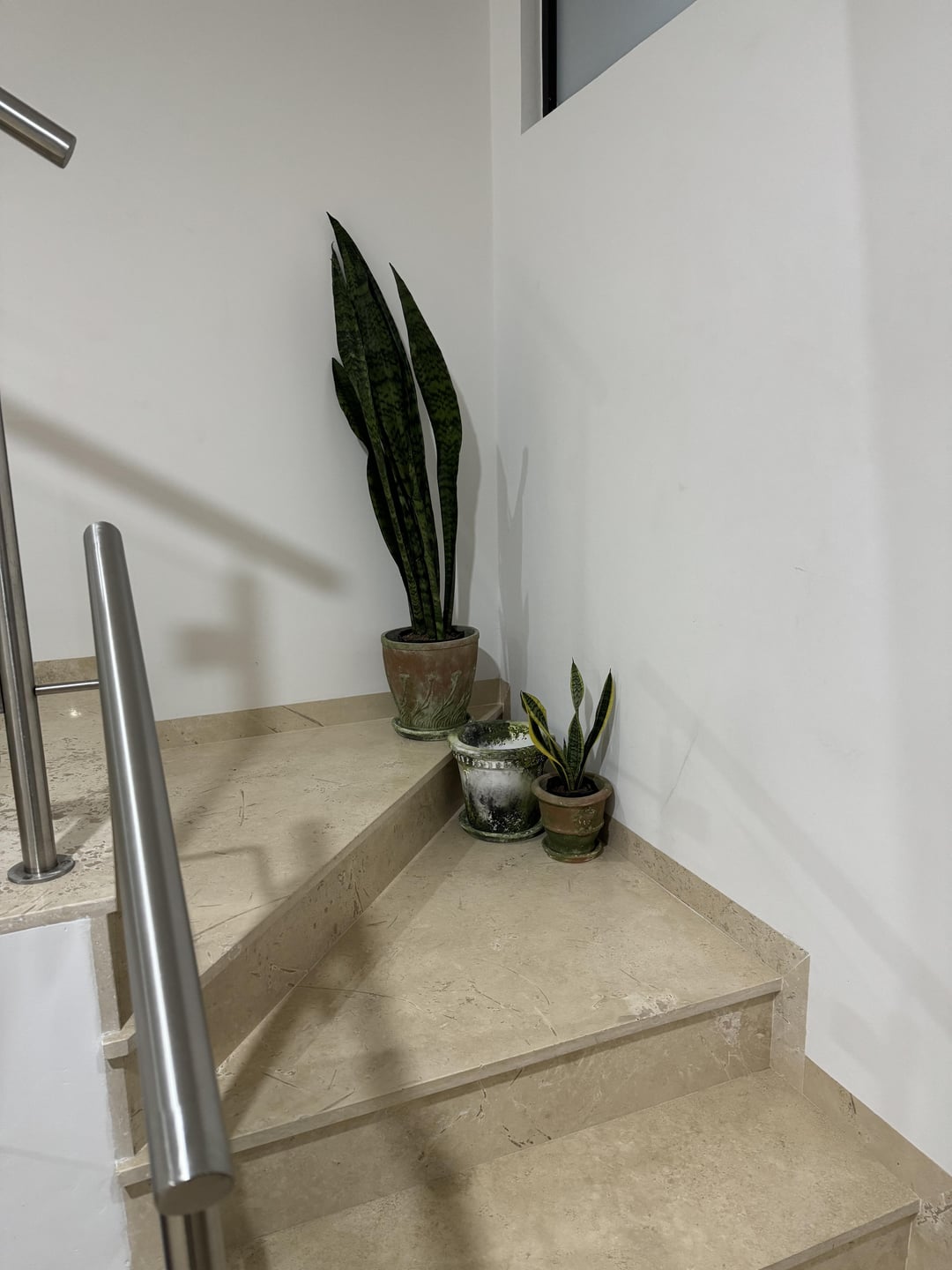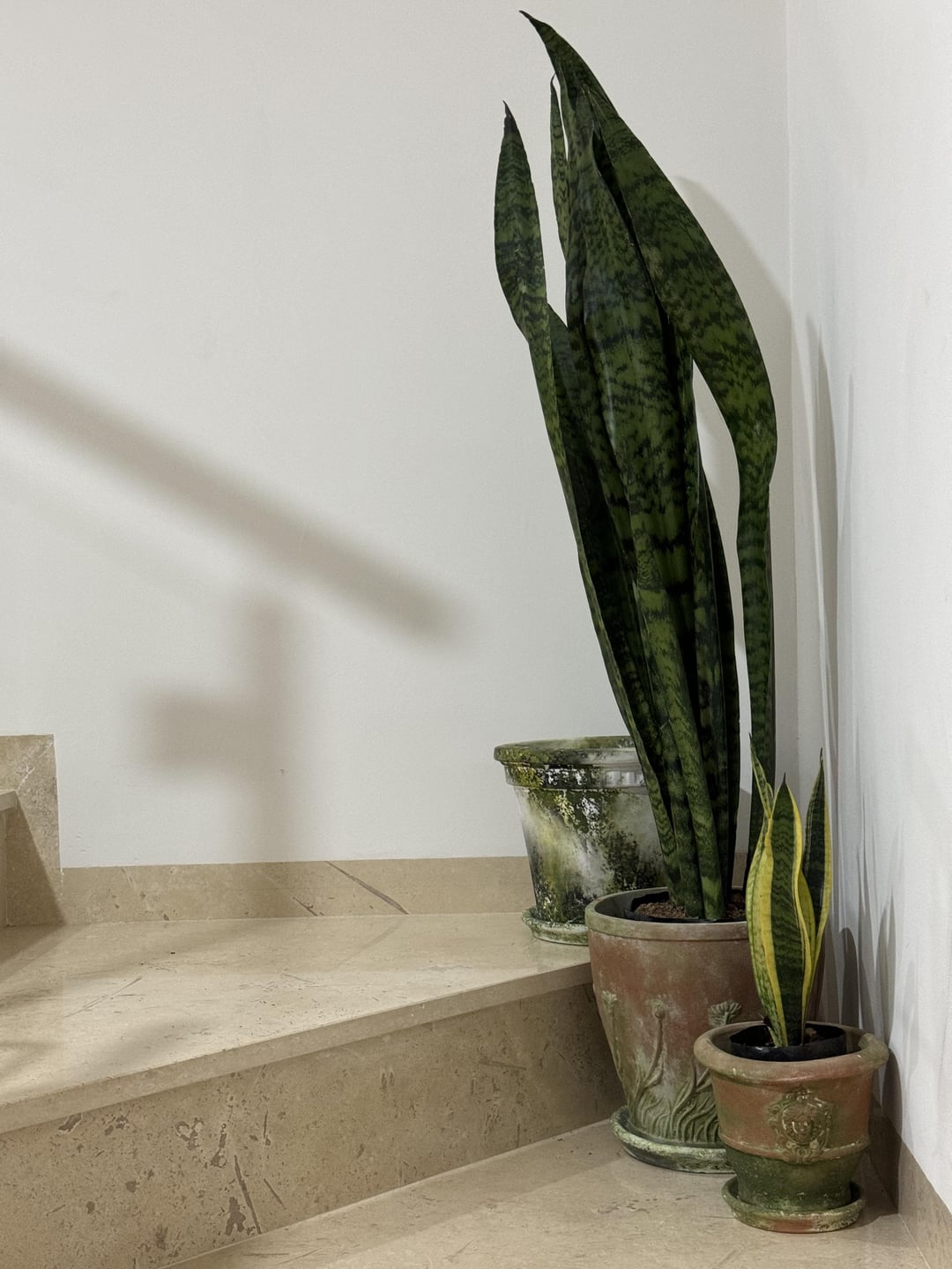 I like that the largest snake plant when in the middle fills the empty space in the corner of the stairwell; and feel that a medium sized snake plant in the back pot would create a nice balance. Thoughts? (This stairwell is near the entrance of our home, for context.)