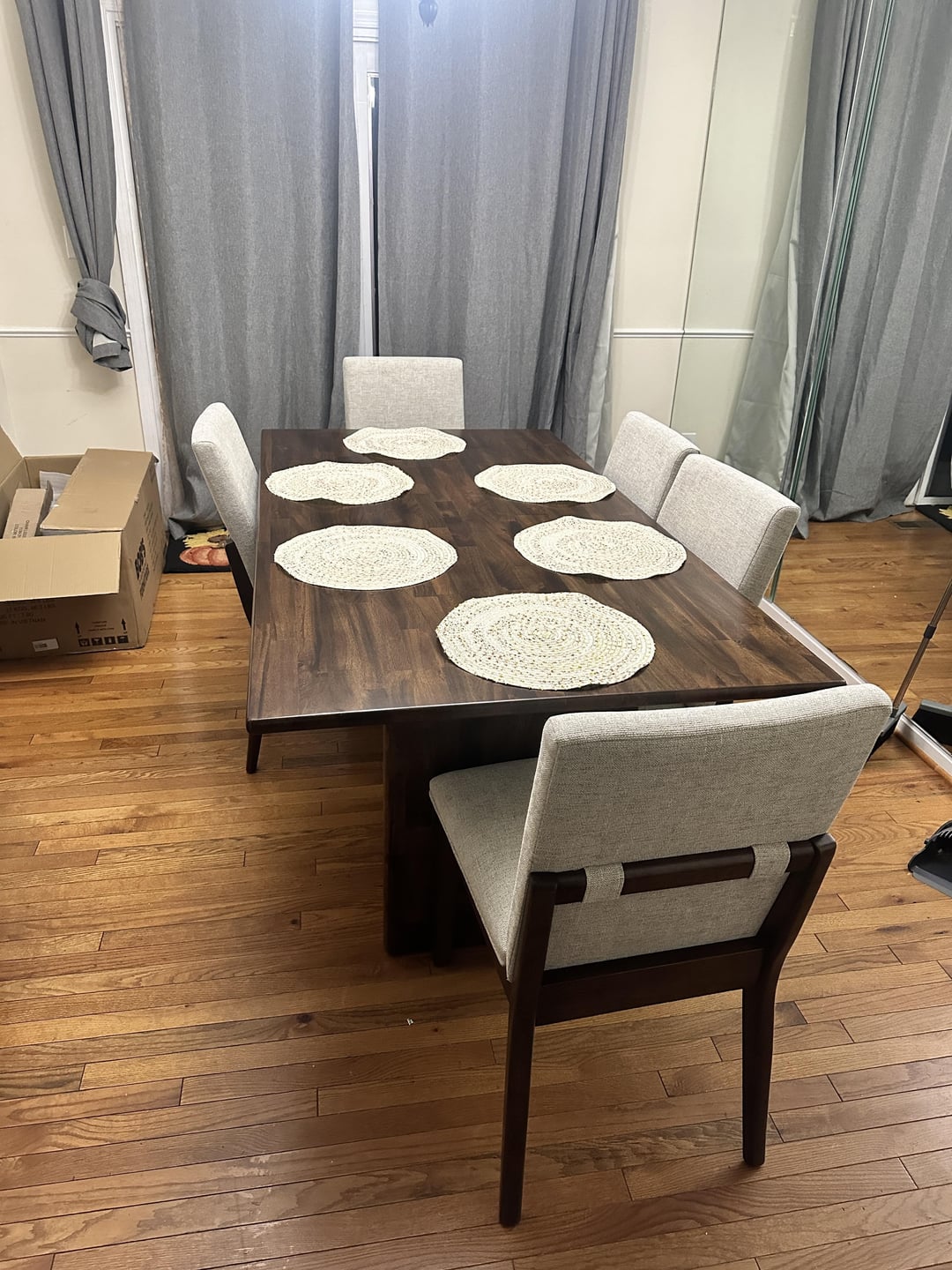 I recently got this dining room table and I need help. Something feels off with the wood colors conflicting. How can I go about improving this?