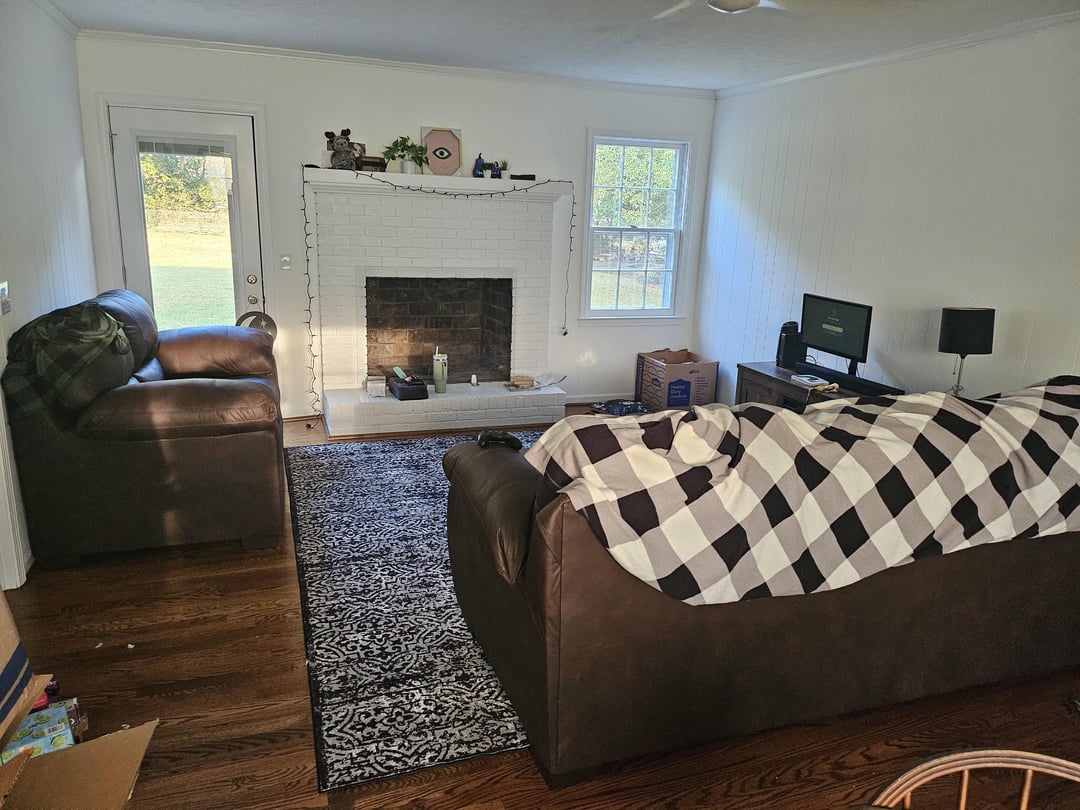 Just moved into a new house, and got my new couches today. This set up is killing me. We're waiting another weekend/paycheck for a bigger TV, which will be mounted on the wall due to my kiddo. I can't put the TV on the left wall, as the back door will hit it when opened. Can't put a couch against the left wall because it blocks the back door. Currently I have the sofa and loveseat in opposite spots, but it's not flowing. To the right is a hallway so a couch can't go right there.