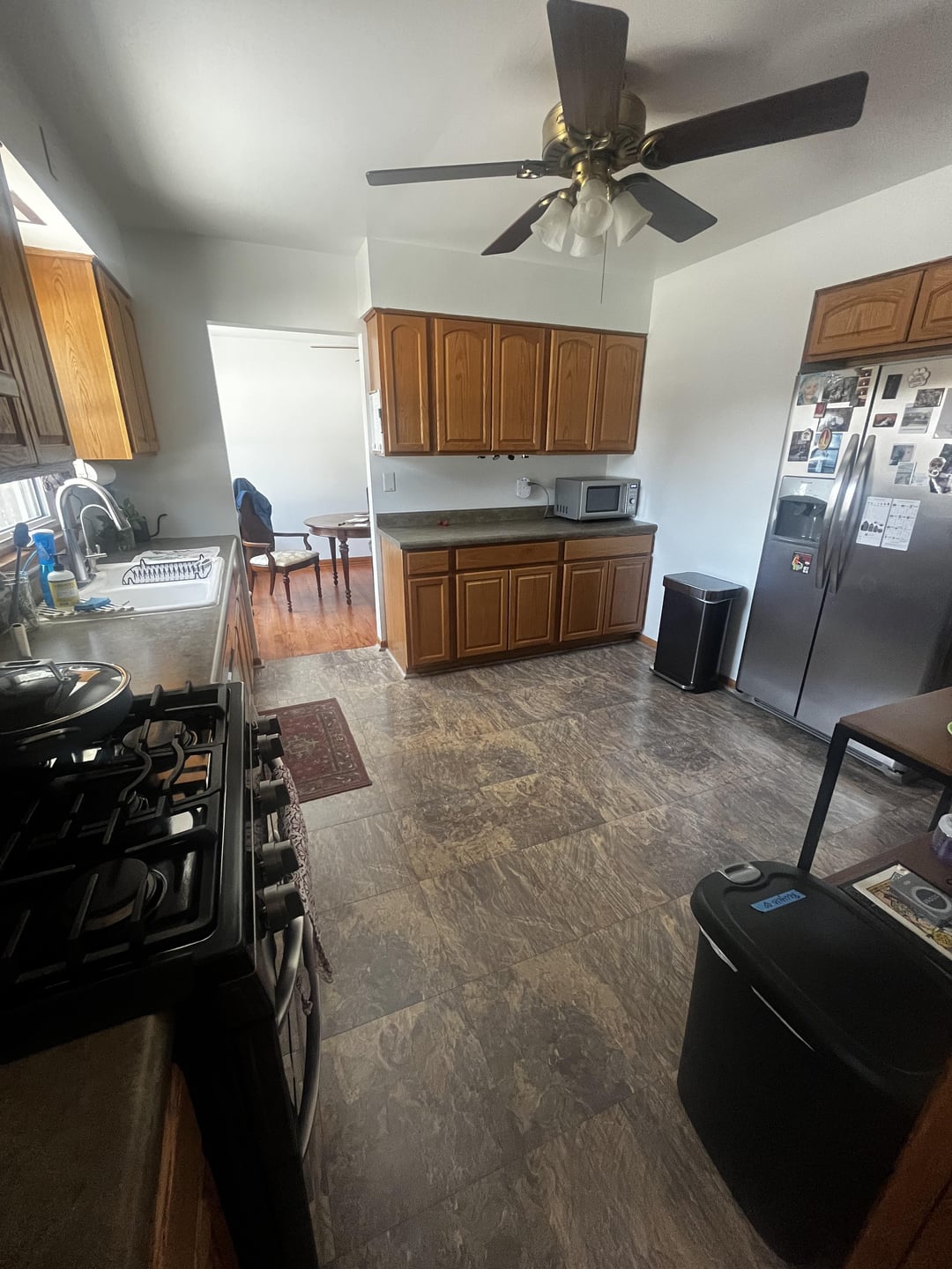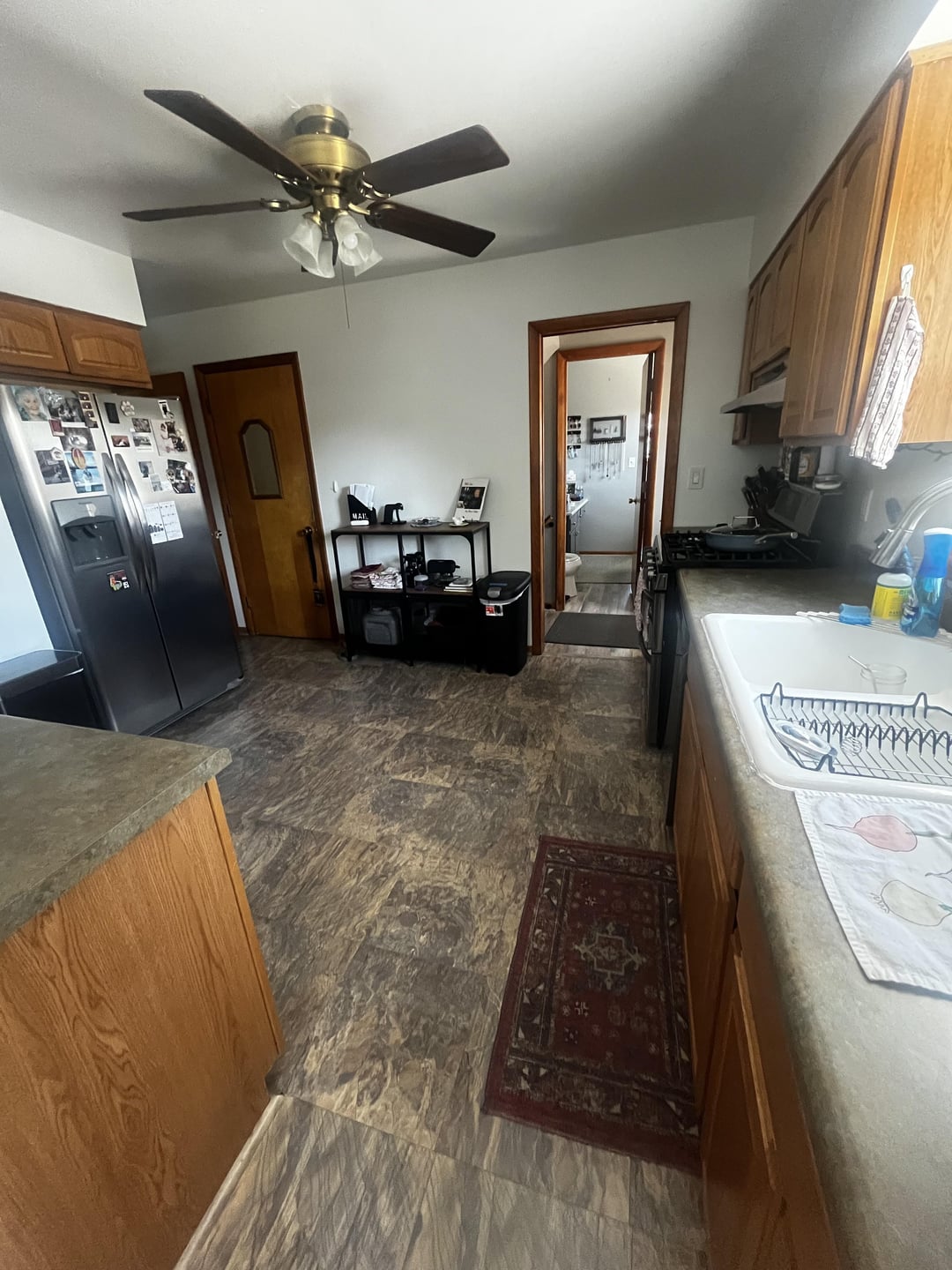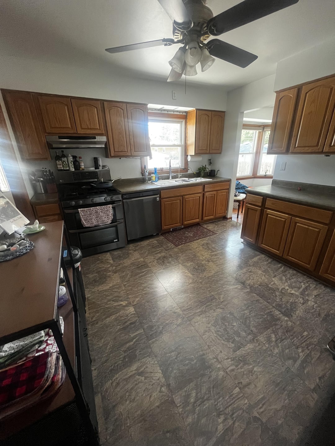 Just bought our home and I despise the flooring and countertops. I also can’t decide if I like the cabinets but I wonder if it’s the contrast with the gray tones in the floor/counters throwing me off. Either way, we are unable to afford new floors or counters right now, so what can I do to make this space more visually pleasant for the time being?