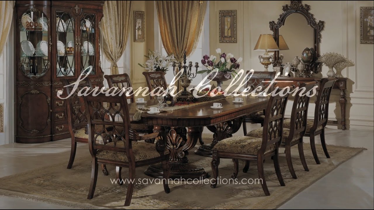 Nantucket Dining Table in Antique Walnut finish. Table features veneer inlay design and spectacular hand-carved details. Chair features cut-out back design with exquisite details all around, upholstered in high-grade European fabric for a luxurious dining set.