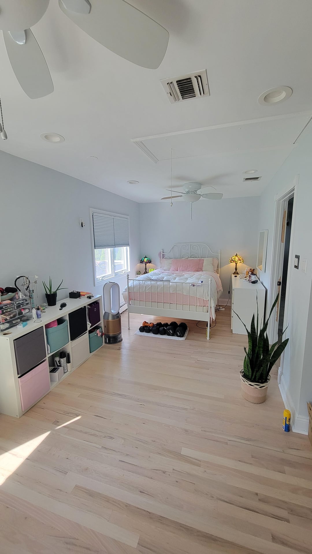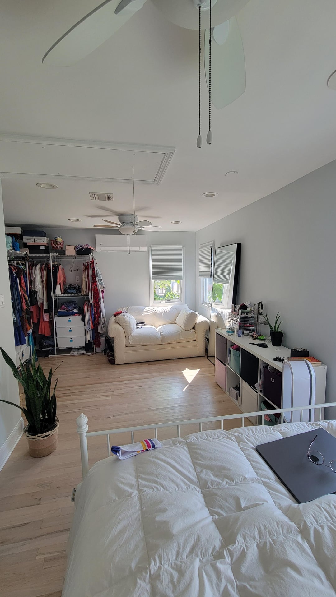 I need a bedroom glow-up. All suggesstions are welcome, but keep in mind I need a little empty space to workout as well. I am not a big fan of how the closet is so out in the open (it looks messy, yet I don't have the budget to get a nicer closet with doors or put freestanding doors right now.