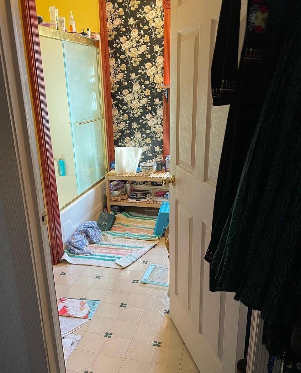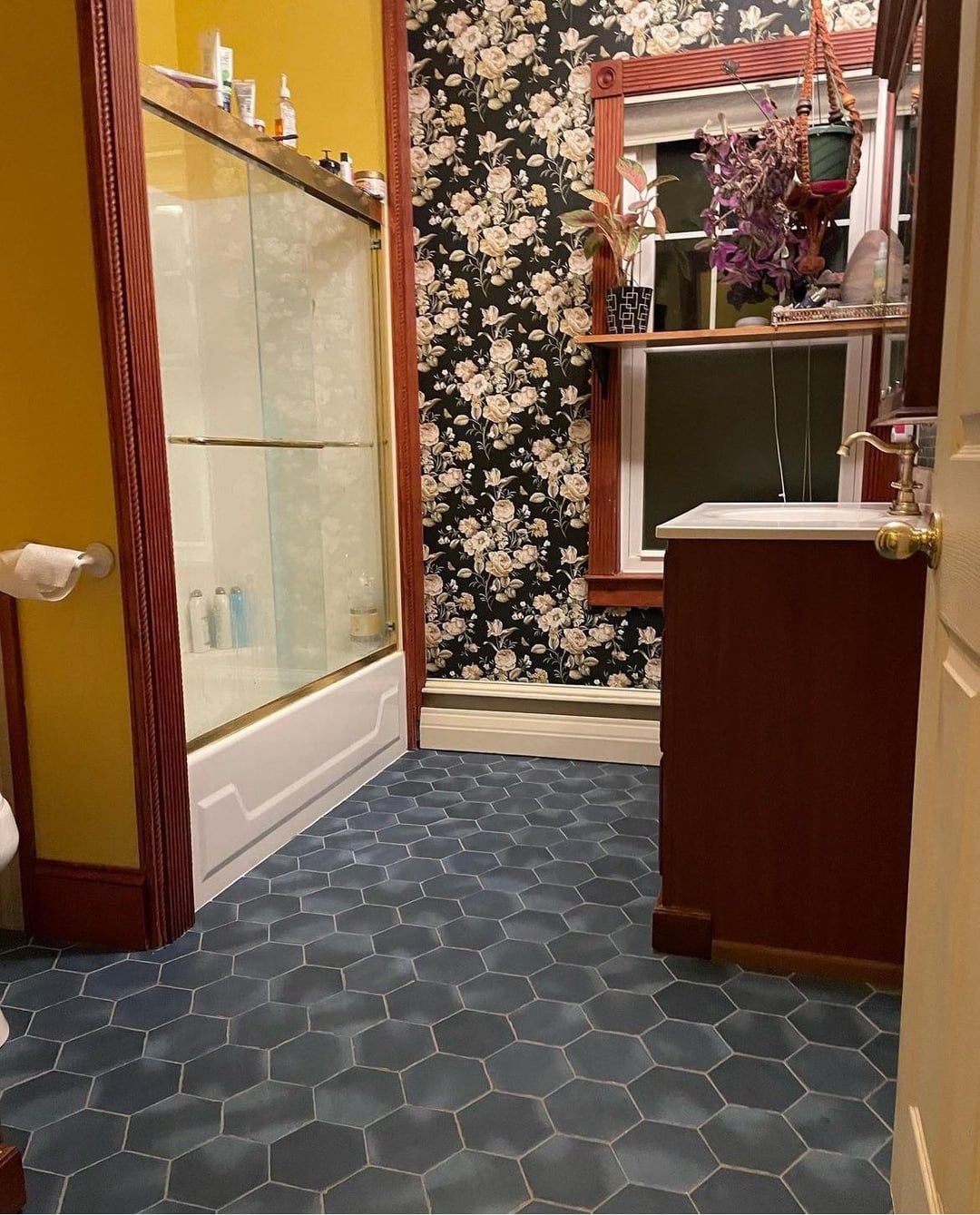 I love the classic yet unexpected pattern of the new kitchen floor, the smooth, soothing blue of the bathroom. I’m really happy with the result, but a little sad I can’t point to the floor and claim success: I did that! But our comfort and uncut toes must come before my ego. It’s funny: I sometimes still follow the pattern around broken tiles when I walk through the kitchen.