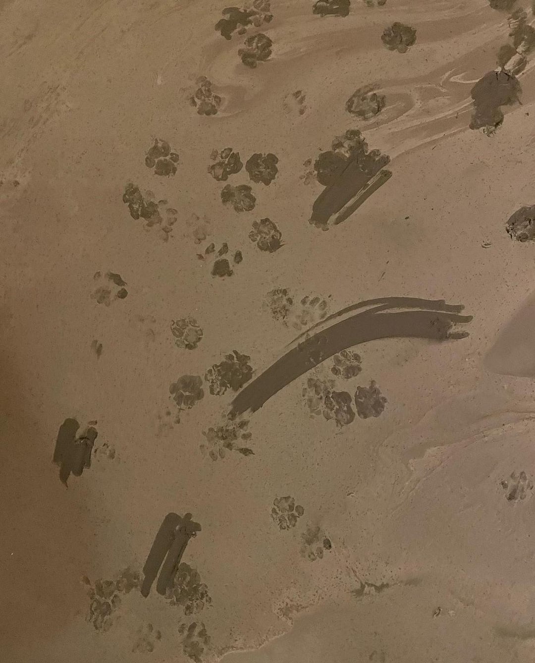(Photos 1,2,3: after, kitchen. 4,5: before, kitchen. 6: bath, after. 7: bath, before. 8: the cement subfloor, signed by the cats.)