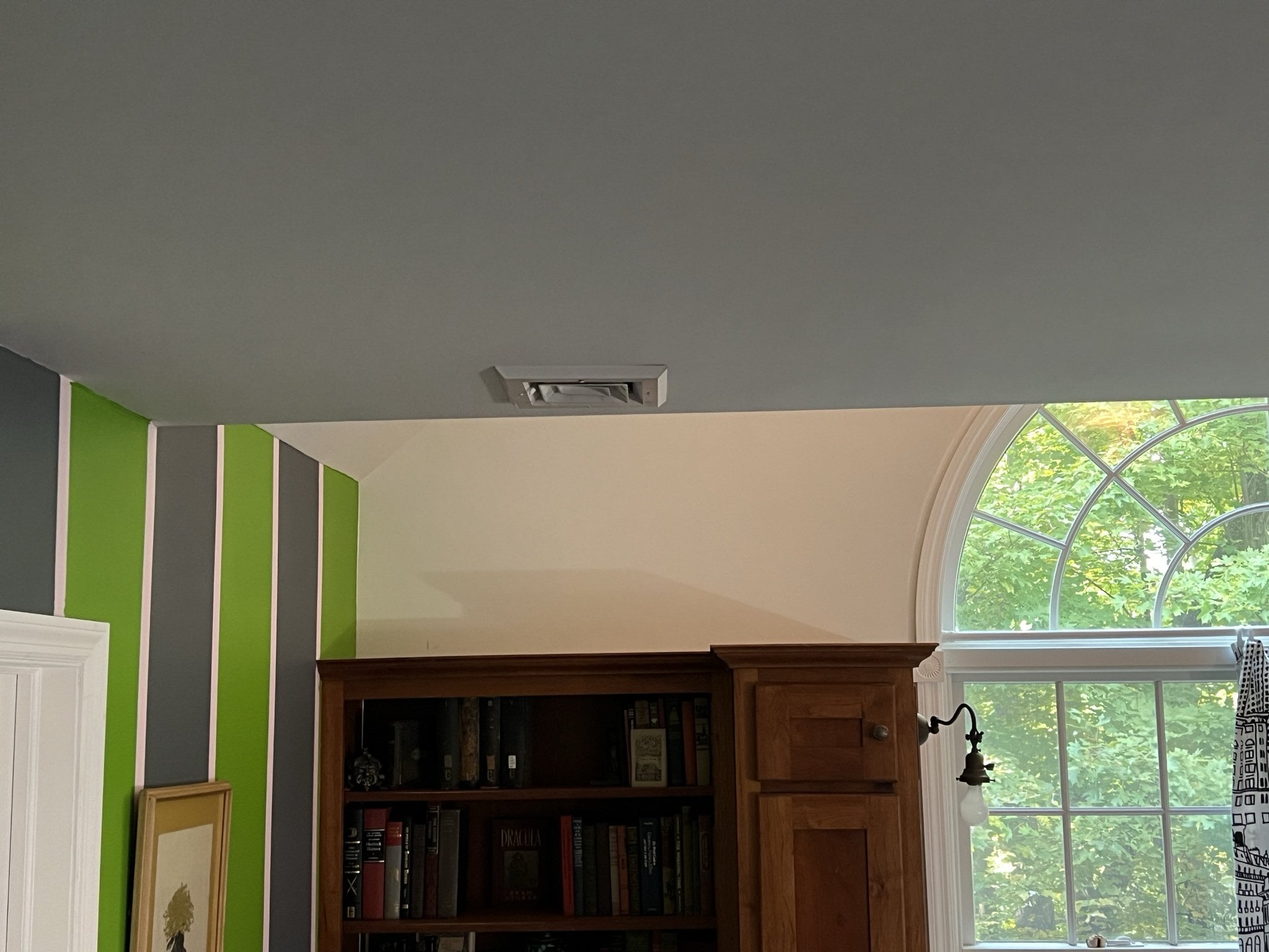 Paint will be Storms in Paris. I have a large window and window seat and bookshelves with cherry wood. The issue is that above the window seat is a vaulted ceiling, which I worry the transition to ceiling to painted wall that goes up to the point of the ceiling will look odd without it being painted. I will post a link to what I'm talking about below.