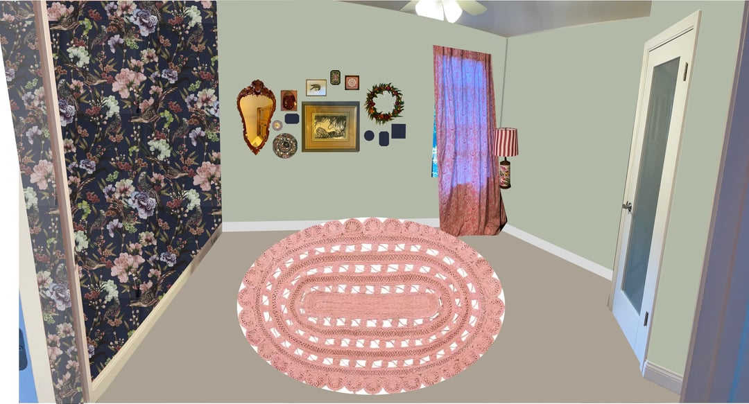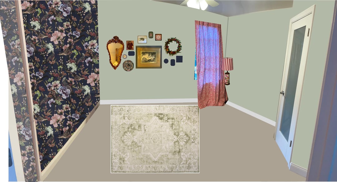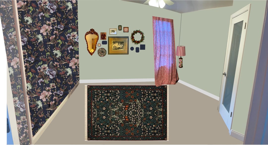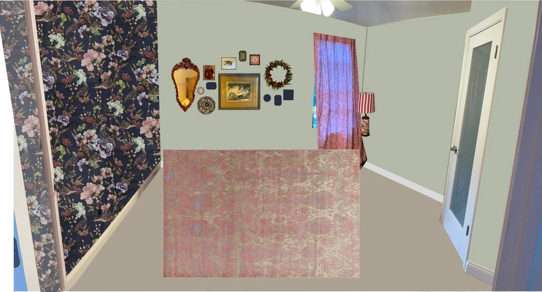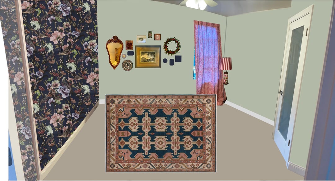 I am going for an eclectic maximalist room for my office – the furniture is a dark walnut stain. I'd love help picking out a rug. I'm leaning towards the green rug or red stripes!