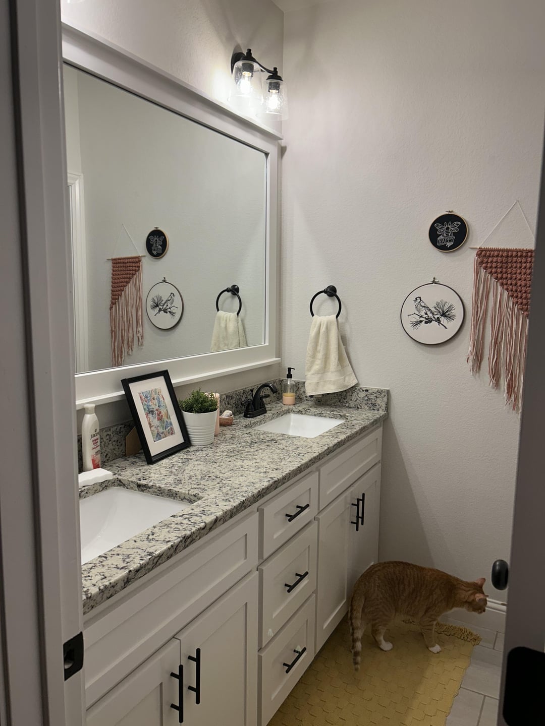 Might want to do stick on wallpaper but I don’t know if I’m up for that task. Maybe just on the wall across from the mirror? Also I don’t know if that would work with how my wall is painted.