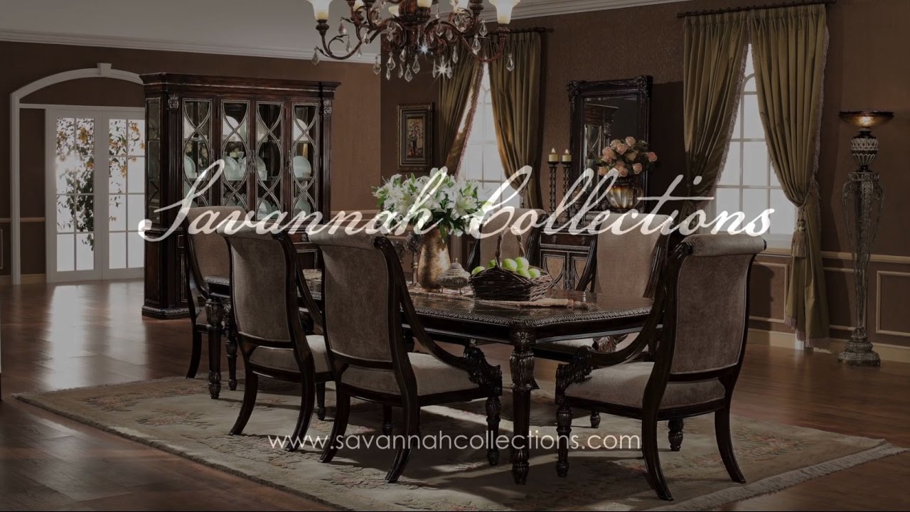 Essex 7-pc Dining Set in Antique Chestnut finish. Table features gold accent with exquisite details carved in solid mahogany wood. Chair features gold accent with refined details and is upholstered in high-grade European fabric. Chair design features curved back contour for a comfortable dining experience.