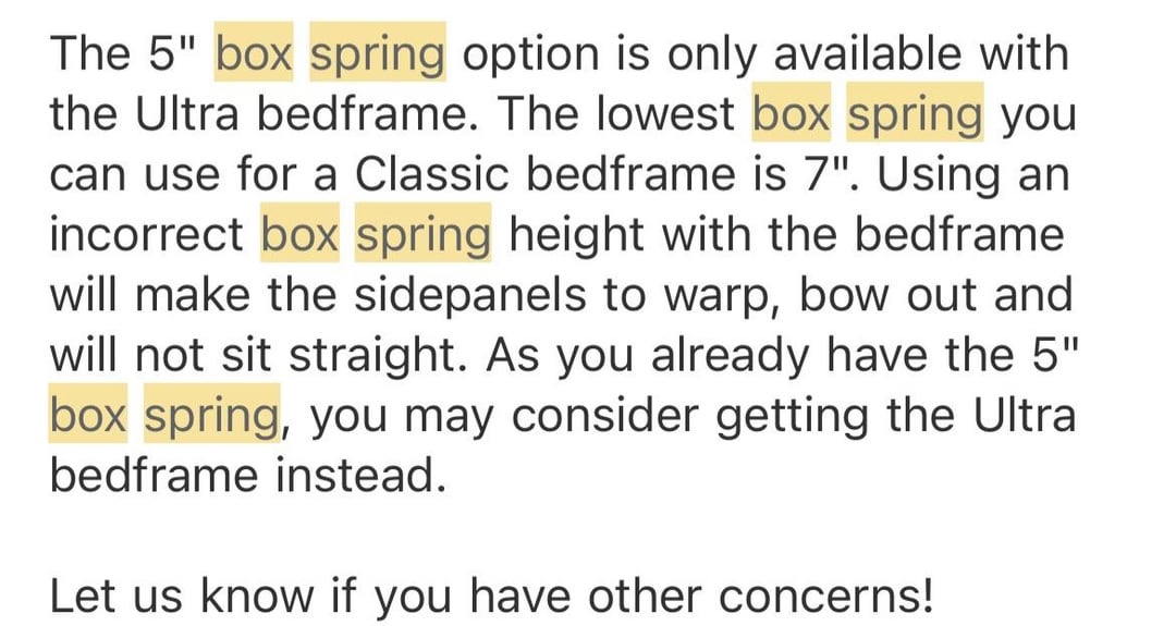 I wanted to get the classic but received this email from them when I inquired about the box spring height. I don’t understand how this would be possible because my mattress will be above the box spring supporting the bed frame, it’s not like there’s nothing there at all.