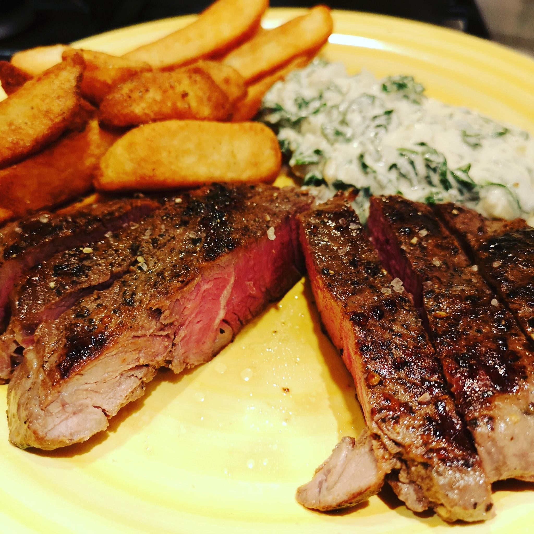 Sous Vide steak, maris piper chips and creamed spinach