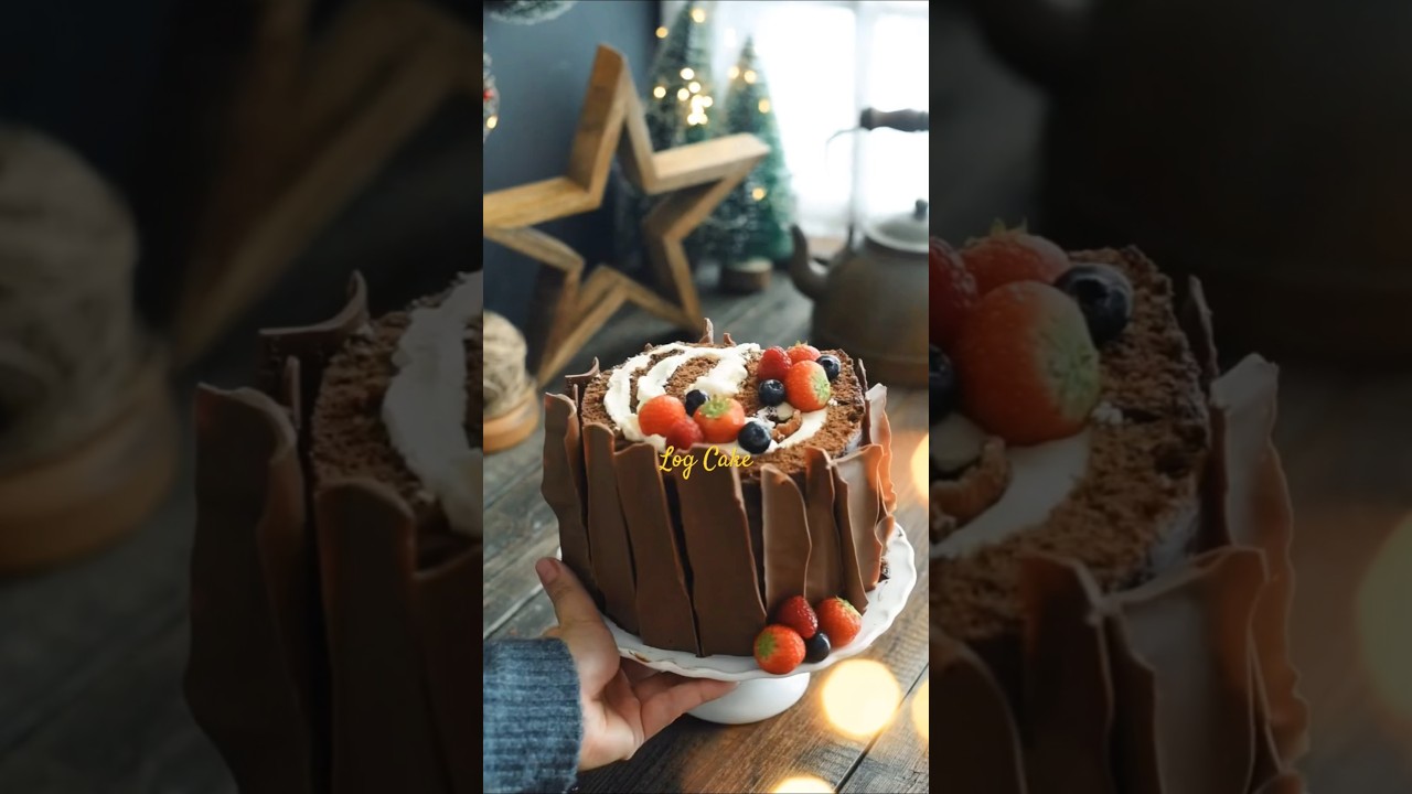 Spread chocolate buttercream evenly on the sides of the cake, then place broken chocolate pieces on it to create the tree “bark”.