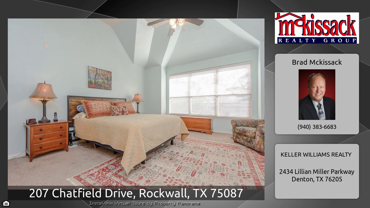The Virtual Tour for the property at 207 Chatfield Drive, Rockwall, TX 75087 listed for $419,900: Other homes for sale by Brad Mckissack of KELLER WILLIAMS REALTY: This Gorgeous 4 Bed 3.5 Bath 3 Car Garage- home welcomes you with Custom Landscaping, Newer Wood & Wrought Iron Front door, Scraped Wood Floors, Iron Spindled Staircase, Vaulted Ceilings & Crown Molding. French doors lead into a Naturally Lit Office. Formal dining room opens into Grande Kitchen boasting: Granite counter tops, Tile Back-splash, Breakfast bar, Island, Stainless Steele appliances, Double Ovens & Gas range. Generous …