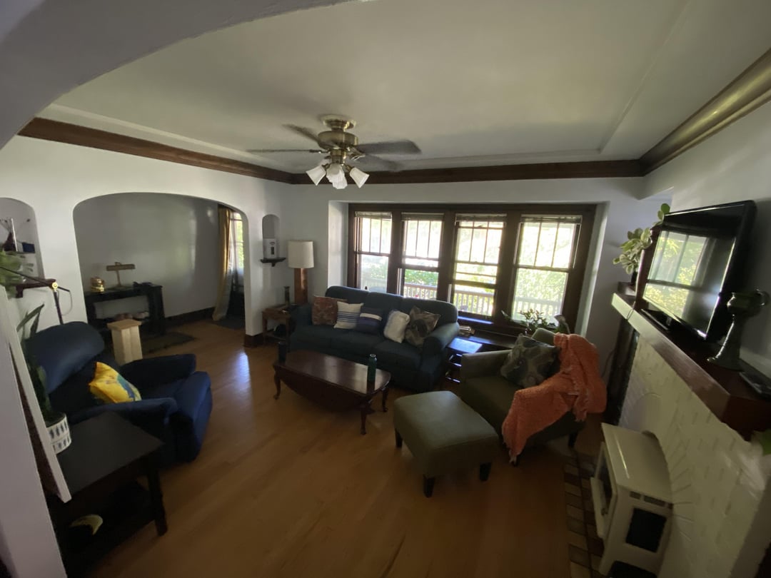 Just moved in and this is where the furniture was plopped down but it feels off. It’s fine for sitting and chatting but feels weird to walk through, not to mention watching tv is awkward. I’d love if the gorgeous windows could be more of a focal point but I’m not sure where the couch would go instead. Of course it needs a rug and better lighting, etc too. I’m typically pretty good at this but feeling really blocked in this room. Any advice is appreciated! (Black tv stand under bookshelf is being given away.)