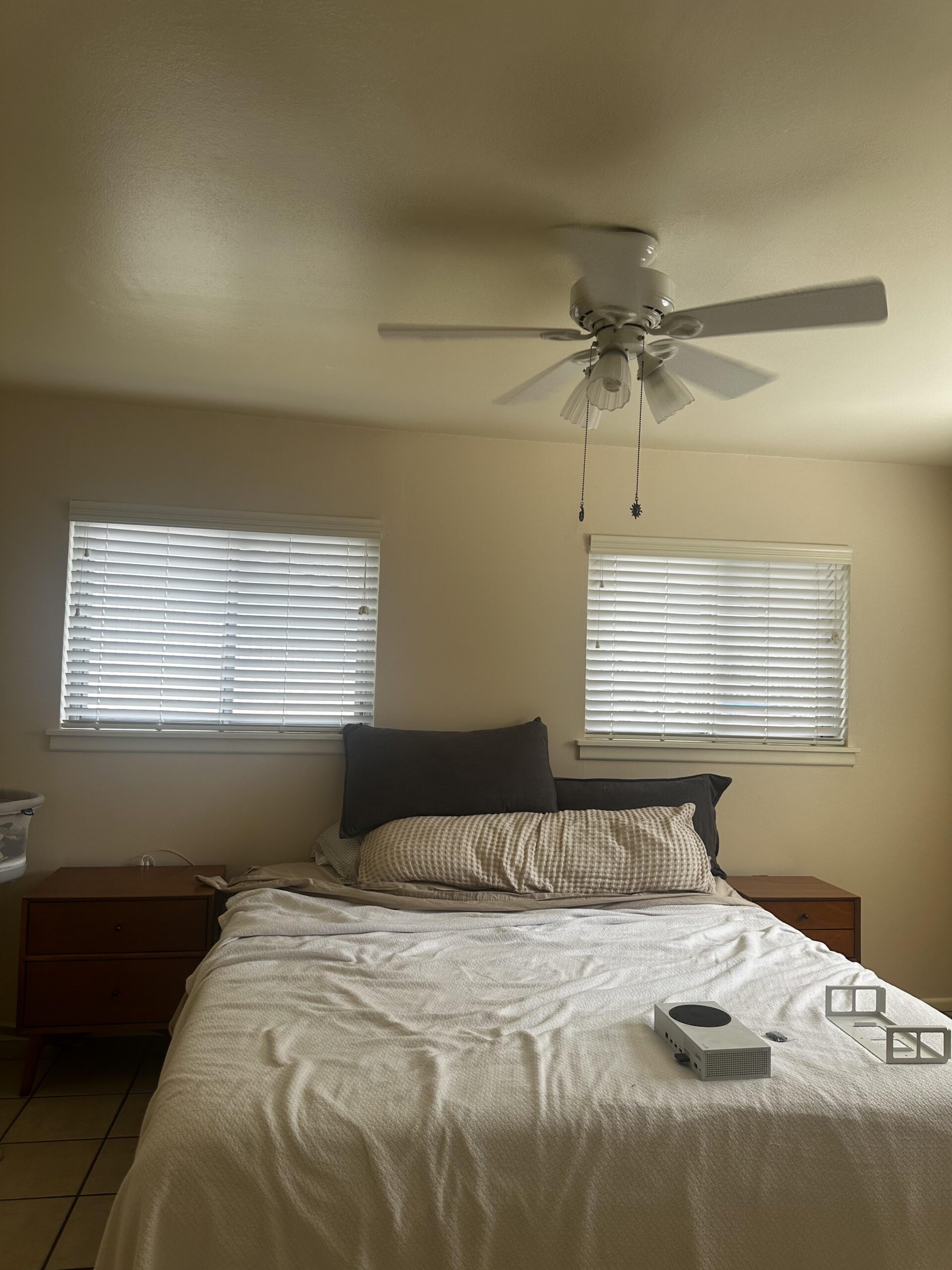 Not sure what to do here for curtains. Any advice would be appreciated. I was thinking one curtain rod with two panels on either side. But someone said that would look weird and I should do two rods, one over each window with four panels total. Concerned about the panel hanging behind the bed… thanks for any input