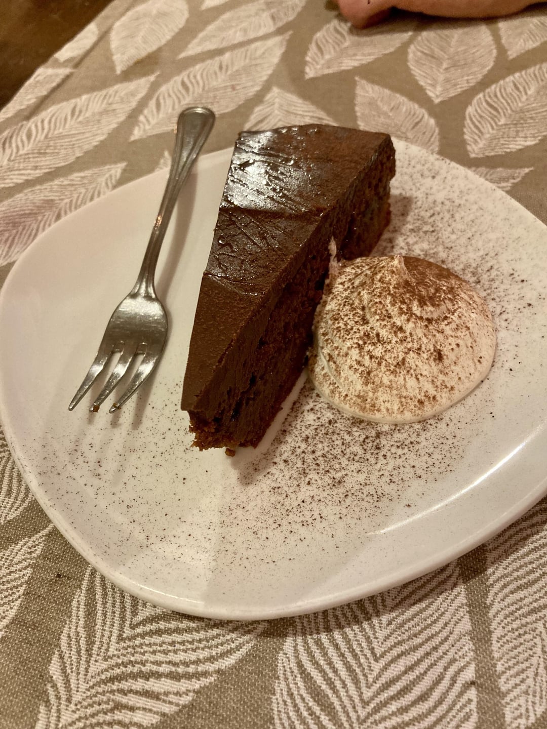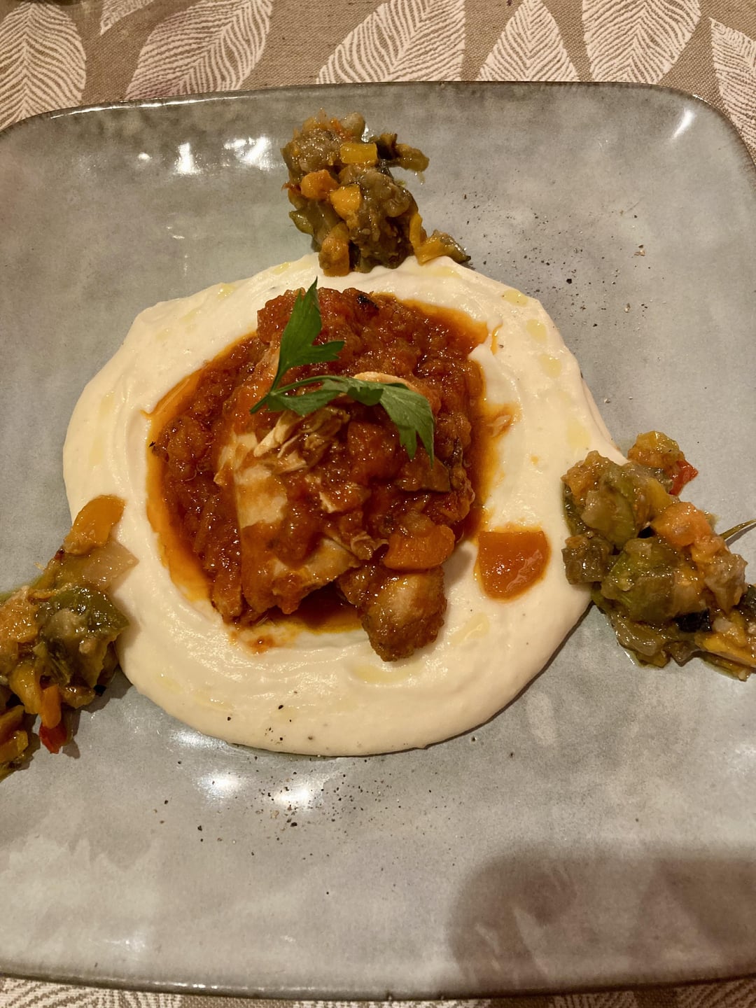 Pumpkin flan with Gorgonzola fondue, big dish with (clockwise) beef tartare, salmon and leeks strudel,turkey with bell peppers and mint and fillo with broccoli cream, then chicken with hot tomato sauce and purée, ending with amazing sachertorte!