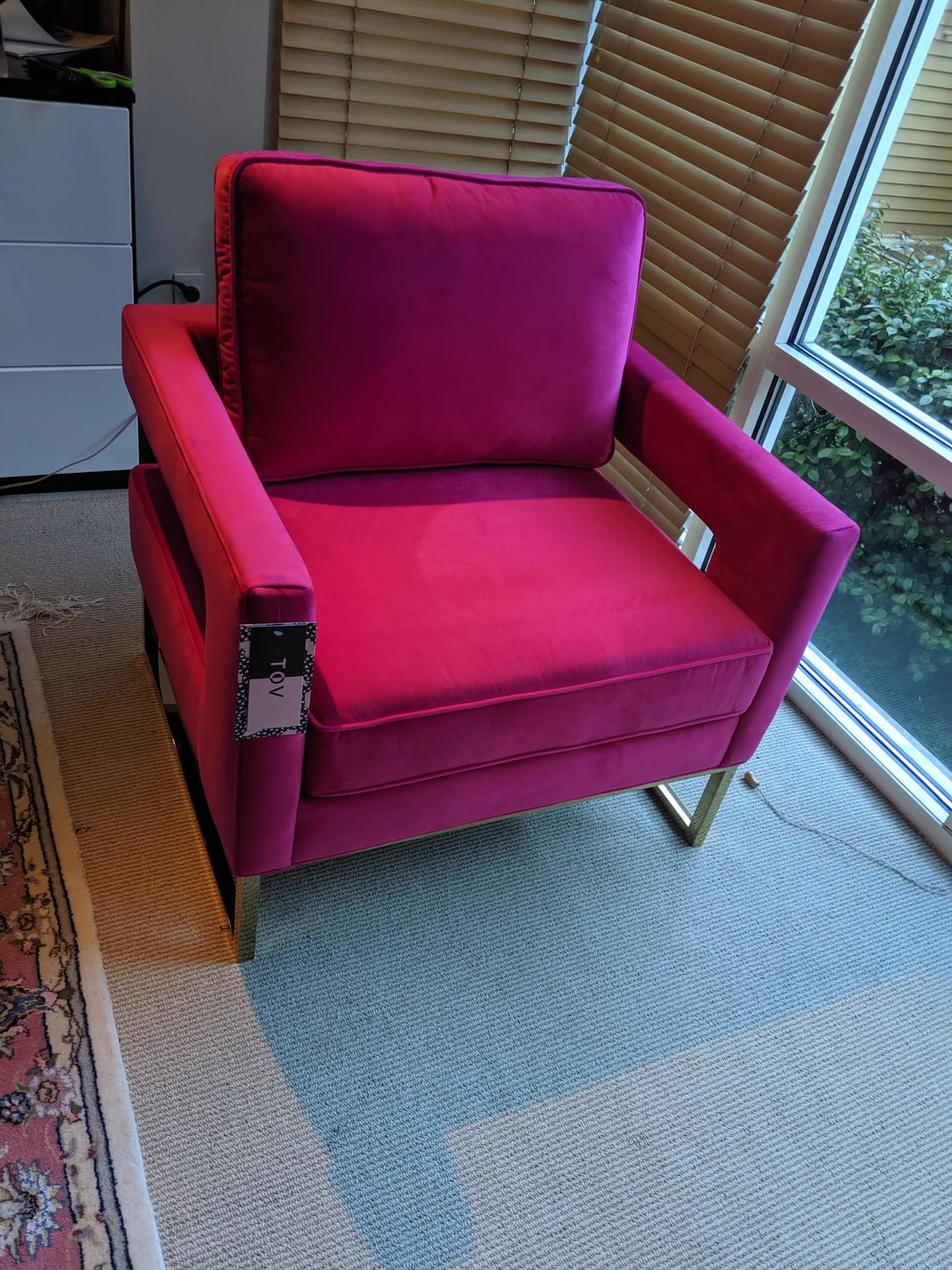 I have a neon pink chair which I really like to keep. What color for the sectional should I get to mute this down a bit?