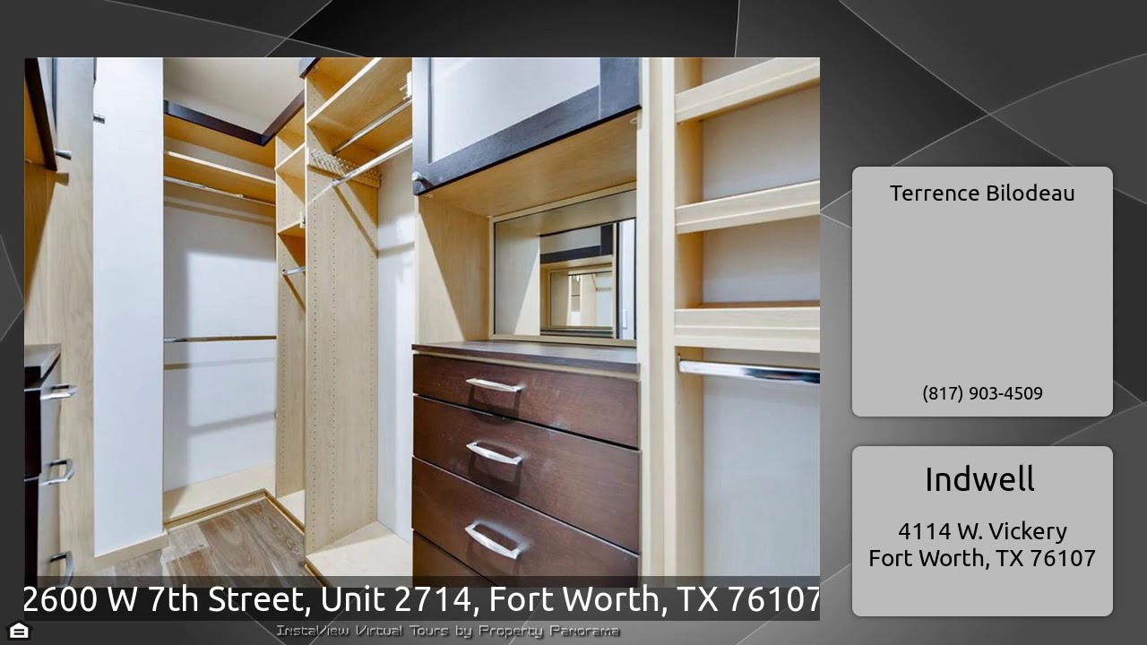 The Virtual Tour for the property at 2600 W 7th Street, Unit 2714, Fort Worth, TX 76107 listed for $510,000: Other homes for sale by Terrence Bilodeau of Indwell: Special PRIVATE RESIDENCES condo. Park in the private access, temp-controlled garage and take the private elevator directly to the 7th floor. Newly installed French Oak Hardwood floors in every room. The Estate Package features GE Monogram Appliances, Wine Refrigerator, California Closets and elegant designer finishes throughout. Custom 15' Electric Drapes and Electric sheer Blinds open to the breathtaking view overlooking the …