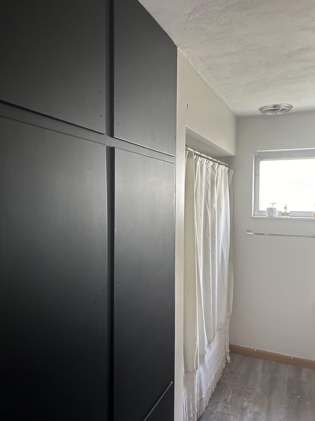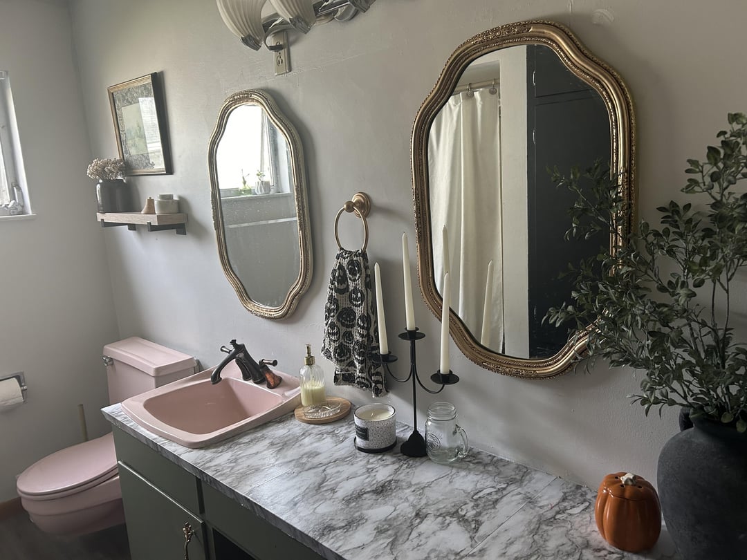 I’m kind of going for that “moody” but also a “comfy and cozy” look for my house. I painted my bathroom cabinets Cambridge Green by Benjamin Moore and painted the built in cabinets black and will be adding gold/brass accents. The walls are currently painted Drift of Mist by Sherwin Williams. Does the color of the walls look okay now or should I paint them something different?