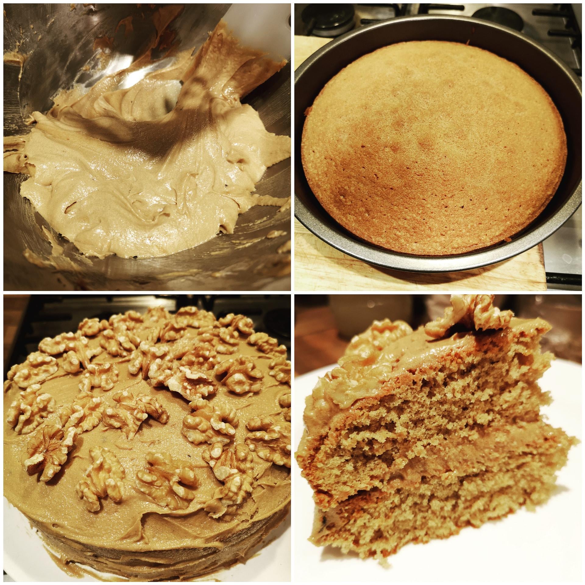 6 Whilst the cakes are cooling, make the coffee buttercream. Beat the butter together with the icing sugar until pale and fluffy, then add the coffee and chopped walnuts. Mix well again and allow to firm up in the fridge for 15–20 minutes