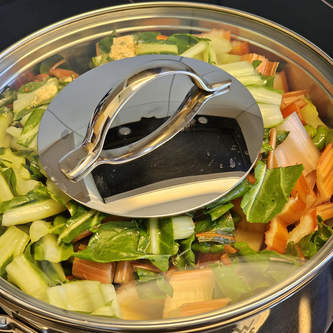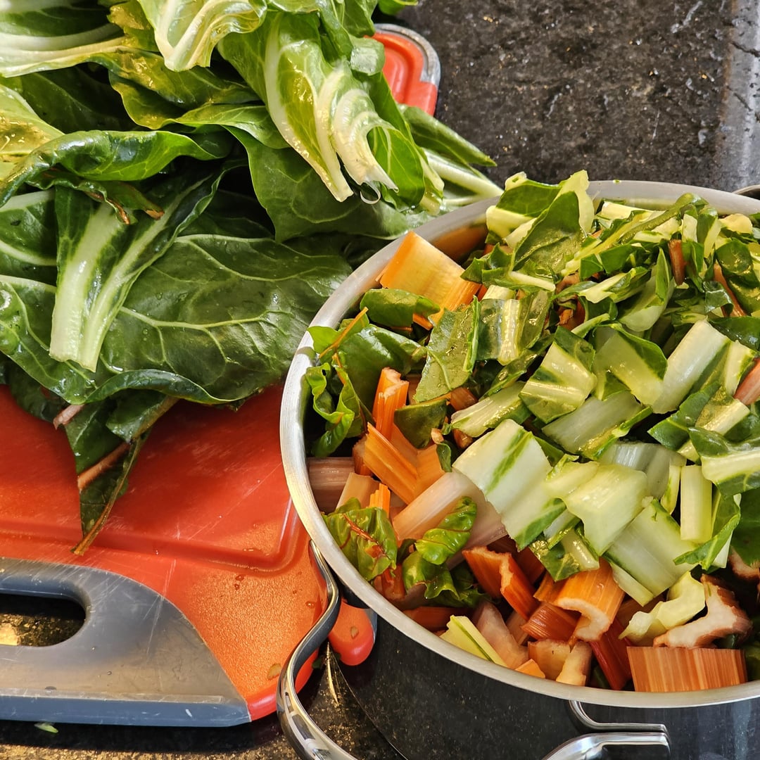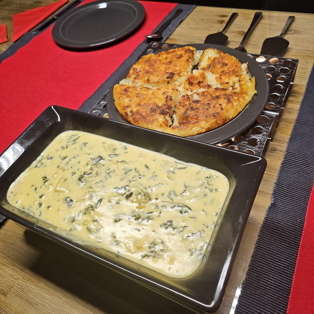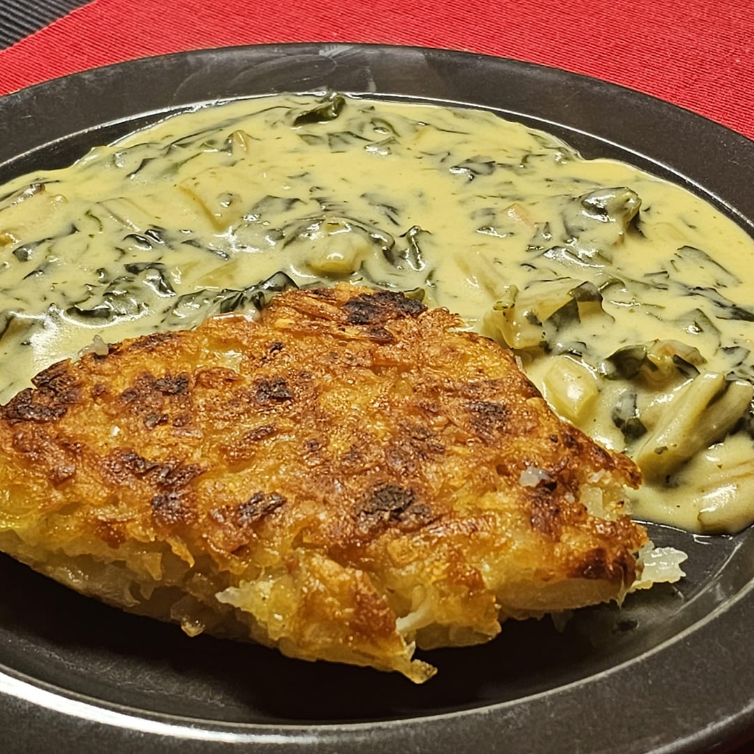 Homemade typical Swiss Rösti, with a large chard (mangold) found at the local farmer’s stand (we actually bought two, the non-pictured one was red), at a creamy cheese sauce