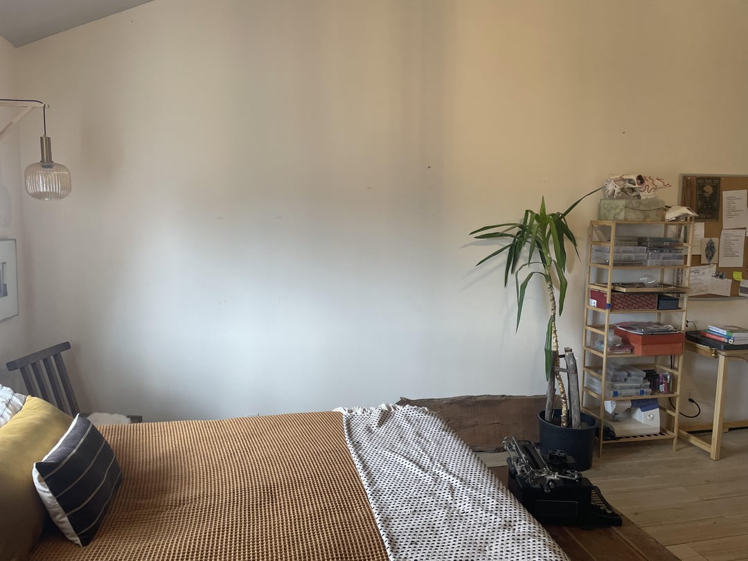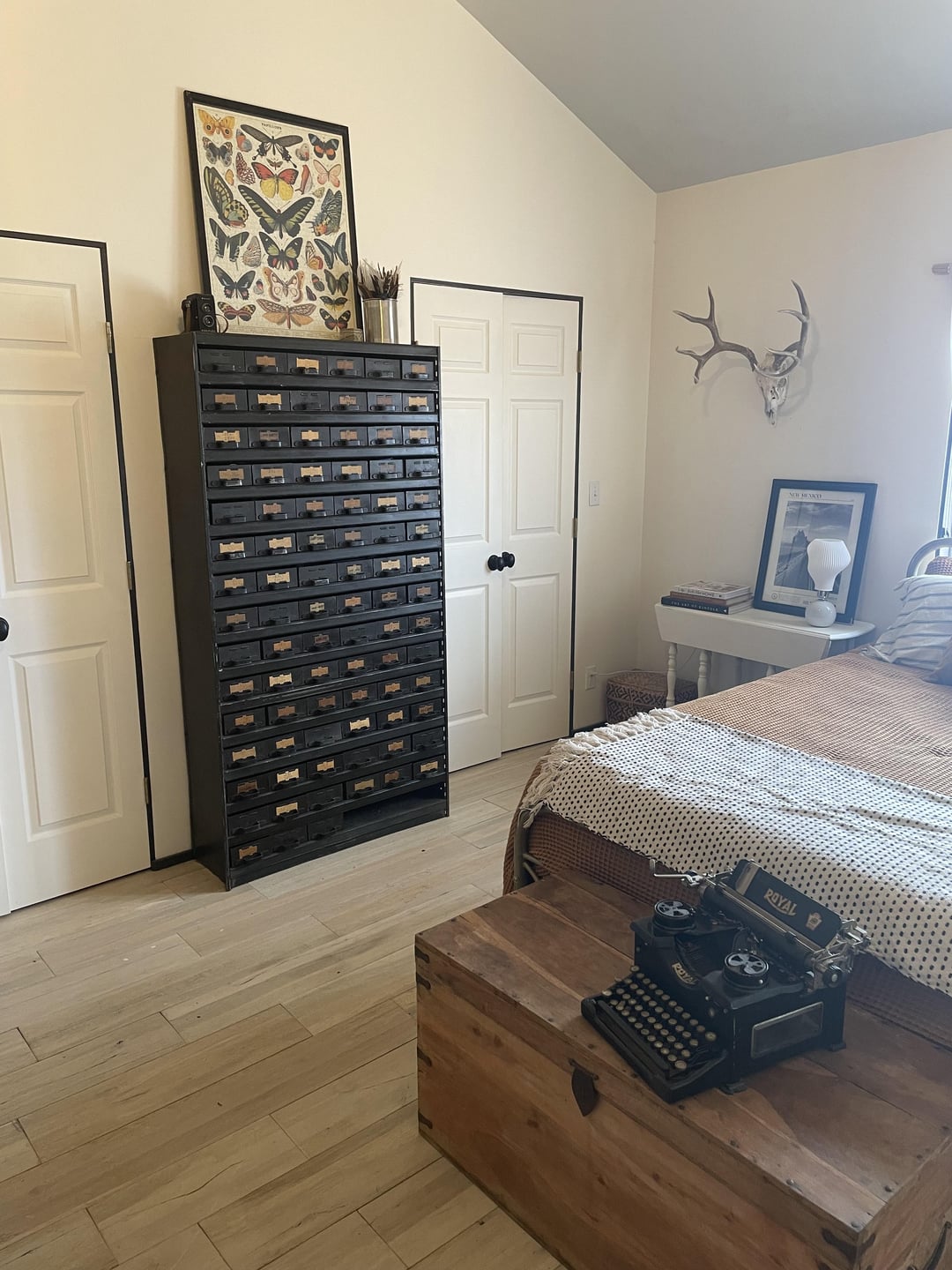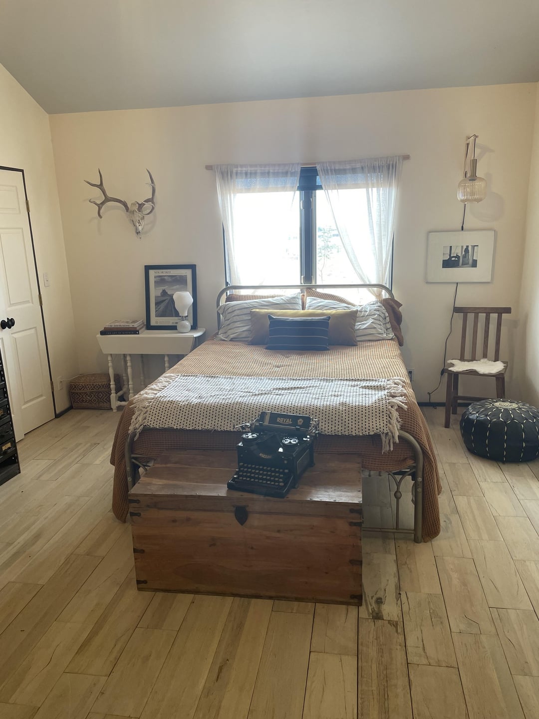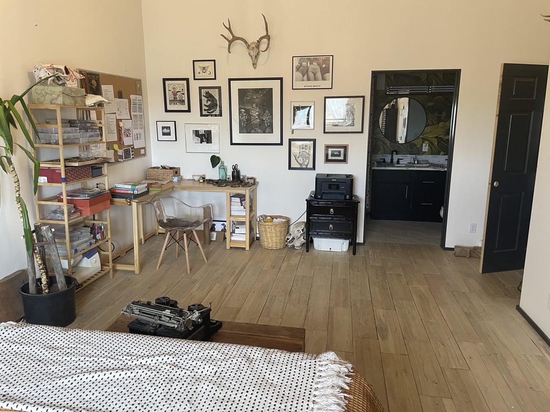 This is my guest room/office/craft space/room my cat sleeps in and I love it except the giant blank wall on one side of the bed (last photo). Our house is A-frame and has crazy tall ceilings on one side of every room. I’ve heard everyone wants high ceilings but I personally find them to be a pain in the ass to paint and decorate. Any ideas on what I should do?