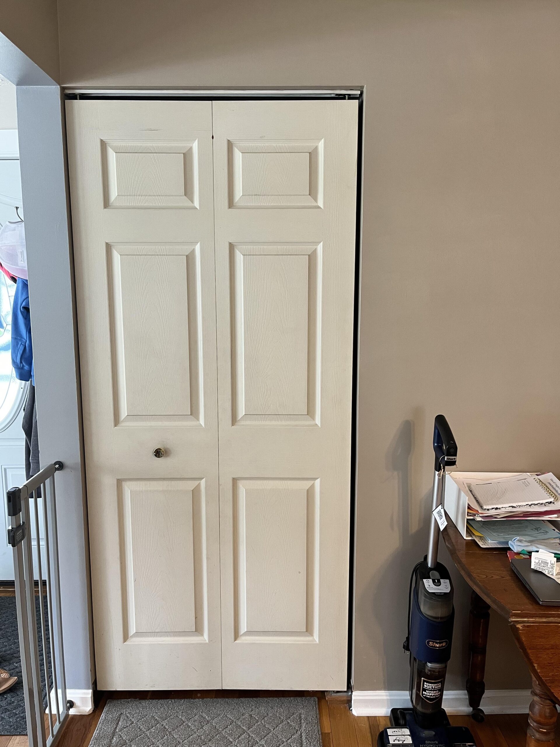 I would like to put a barn door style in place of the bifold door. The issue is that it butts up against the wall so I don’t think there is enough space for a barn door to fully close. I just hate how the current door has a gap at the top. It just looks awkward. We also don’t have an entranceway as you can see a glimpse of my front door to the left. Don’t mind the cluttered table. And mop. I need to redo this area as it is in the dining room.