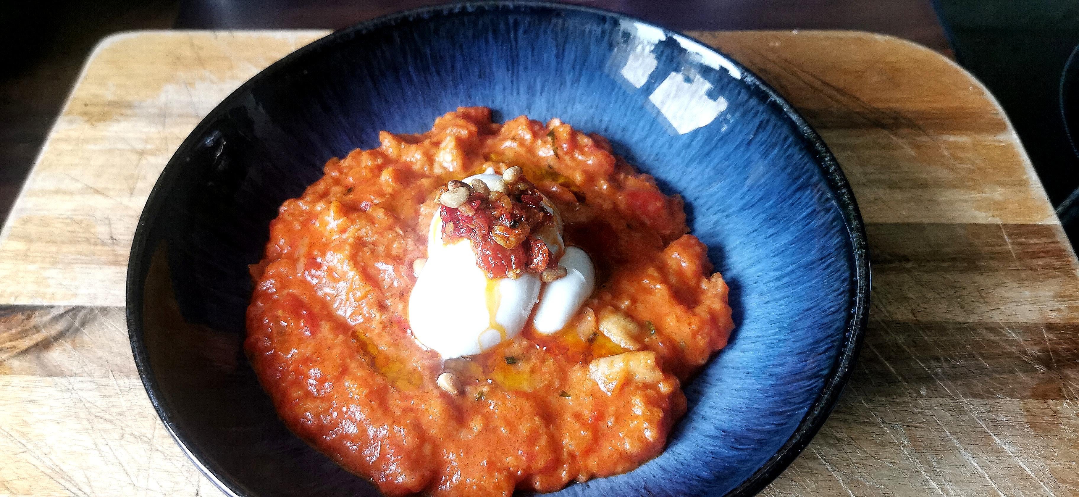 Pappa al pomodoro with basil oil, toatsed pine nuts and burrata