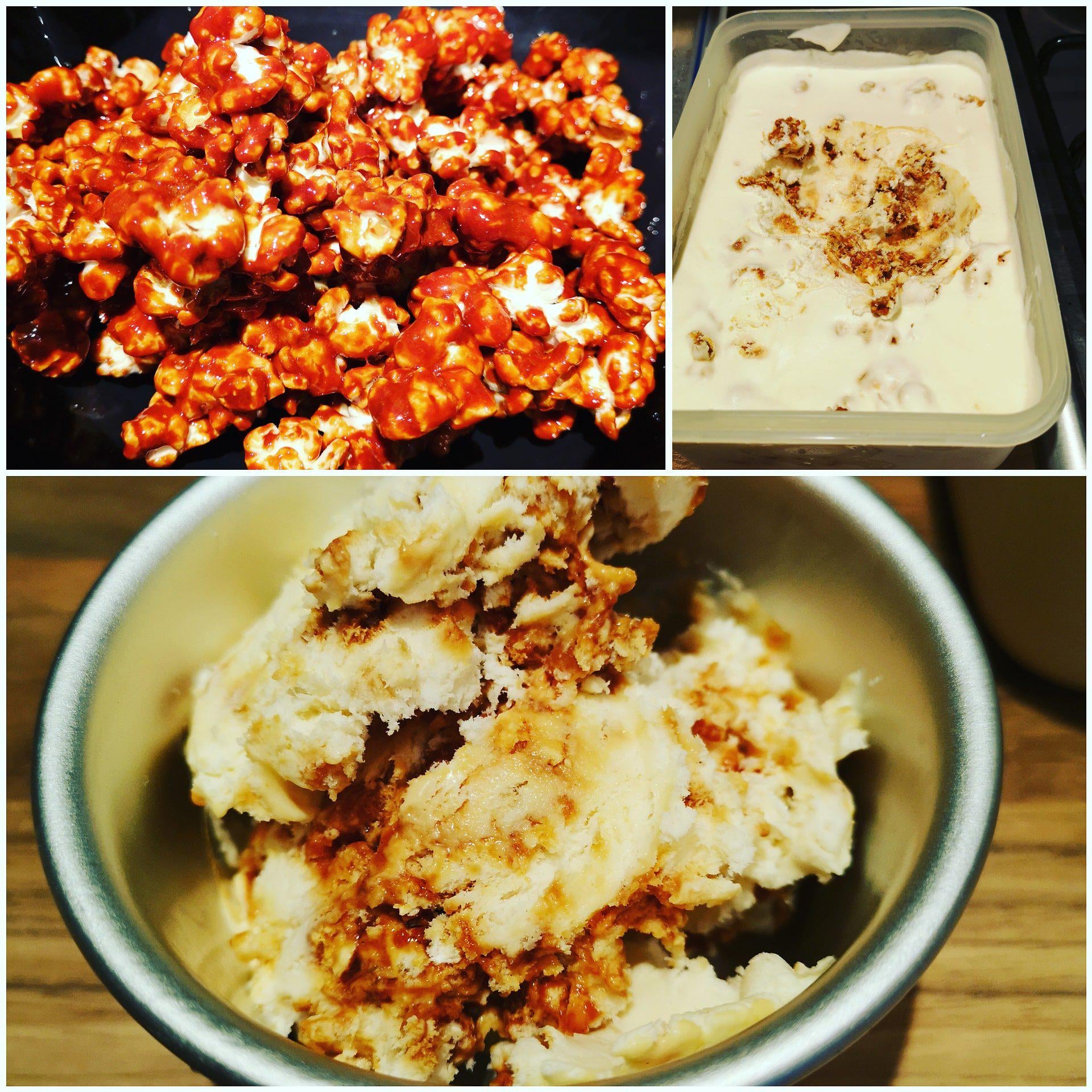 jack_hudson2001 1 year ago For the caramel glaze:¼ Cups Sugar2 Tablespoons Water¼ Teaspoons Saltgets color add in 2 Tablespoons Butterthen add stir in ½ Teaspoons Baking sodaadd over the pop corn then into a tub of vanilla icecream and freeze