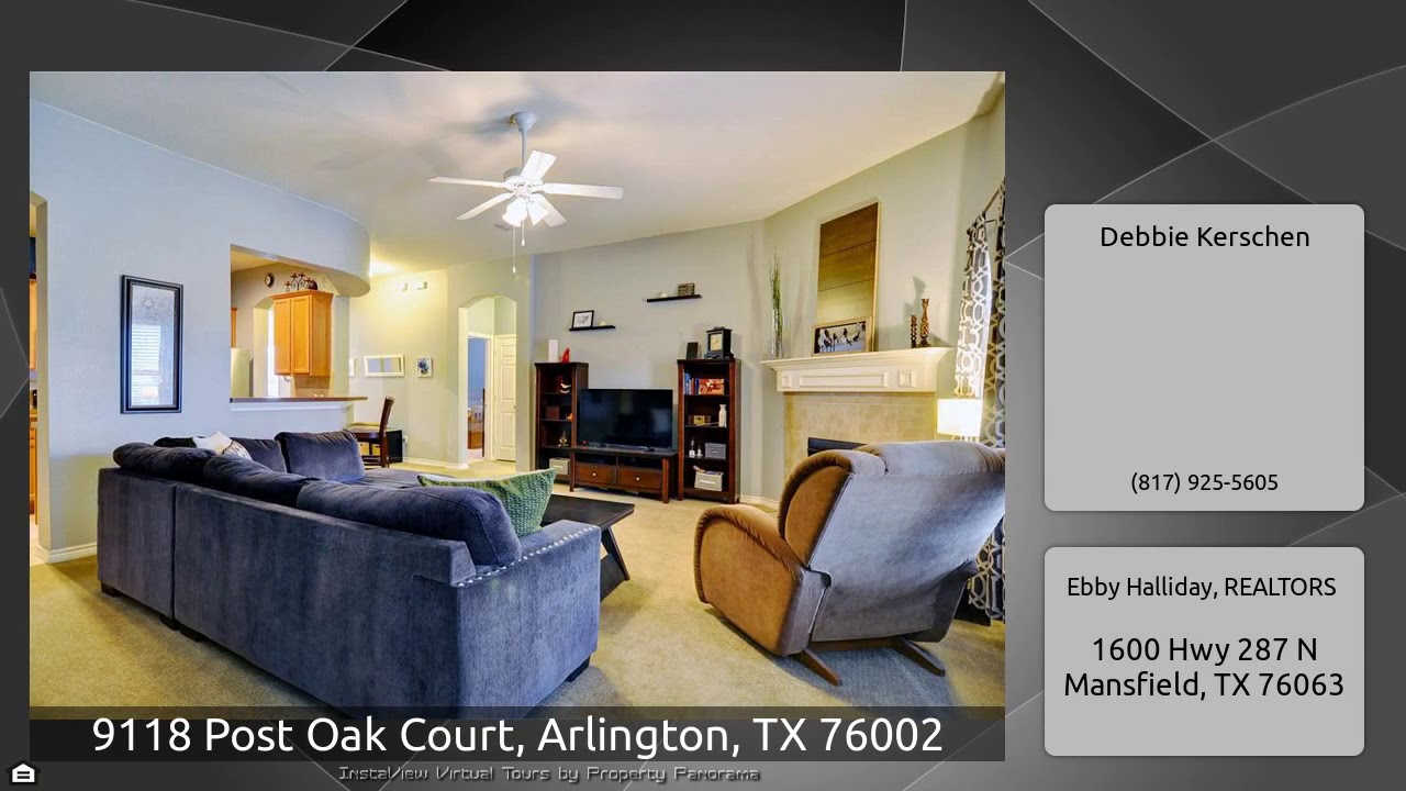 The Virtual Tour for the property at 9118 Post Oak Court, Arlington, TX 76002 listed for $267,500: Other homes for sale by Debbie Kerschen of Ebby Halliday, REALTORS: This beautifully maintained home is located in the desirable Mansfield ISD with a community pool on a long cul de sac street. Off the entry is a study with glass french doors and large windows for natural light. The formal dining is currently being used as a living area. The kitchen is centrally located with an eat in kitchen that has access to a smaller side patio. The breakfast bar opens to the large family room that has …
