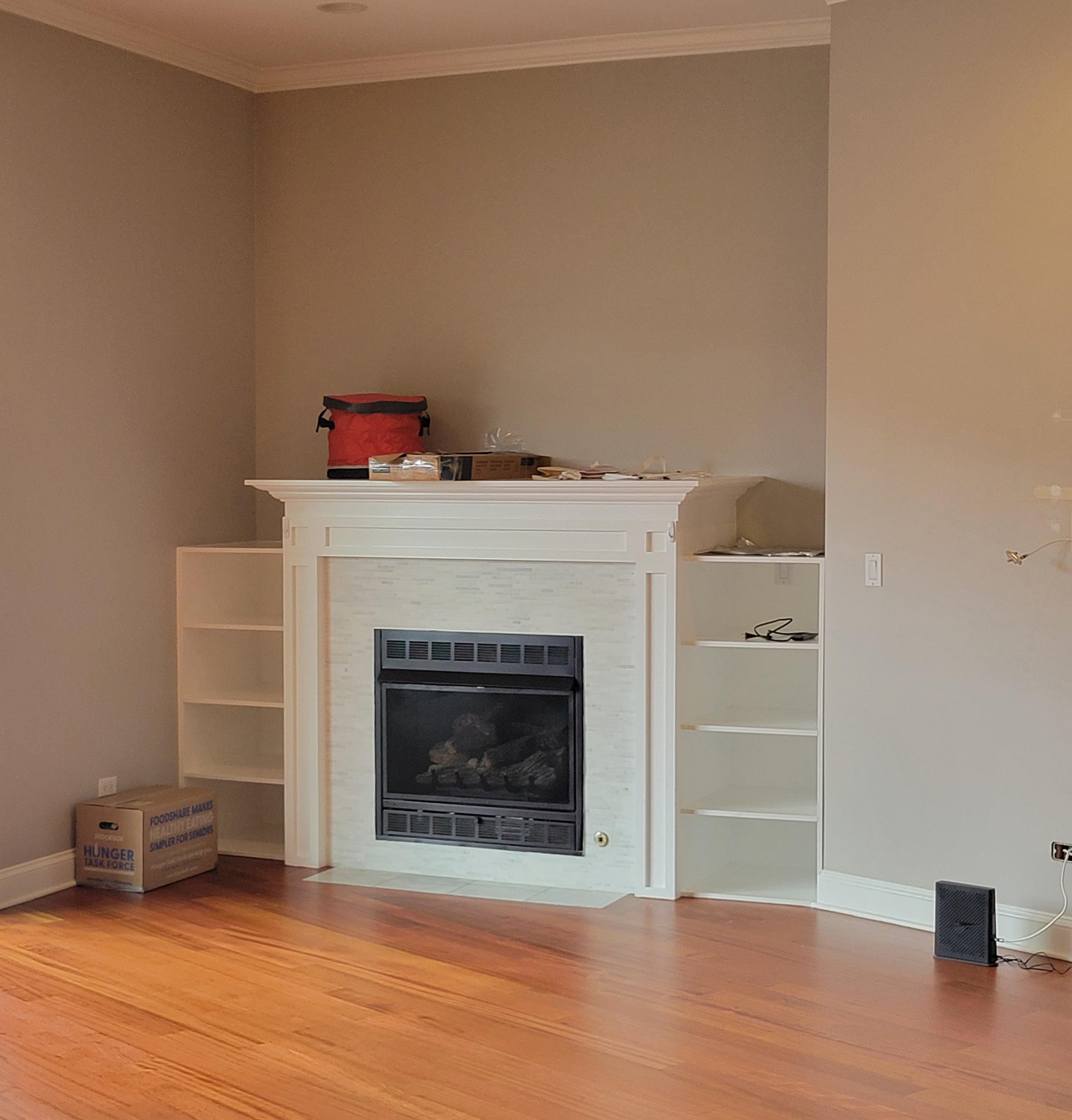 We have this lovely fireplace with an additional space to the right for the TV. Hoping to make the fireplace more of a focal point. I was thinking of painting the shelves/frame and adding a big piece of art above. Any suggestions? Thank you!