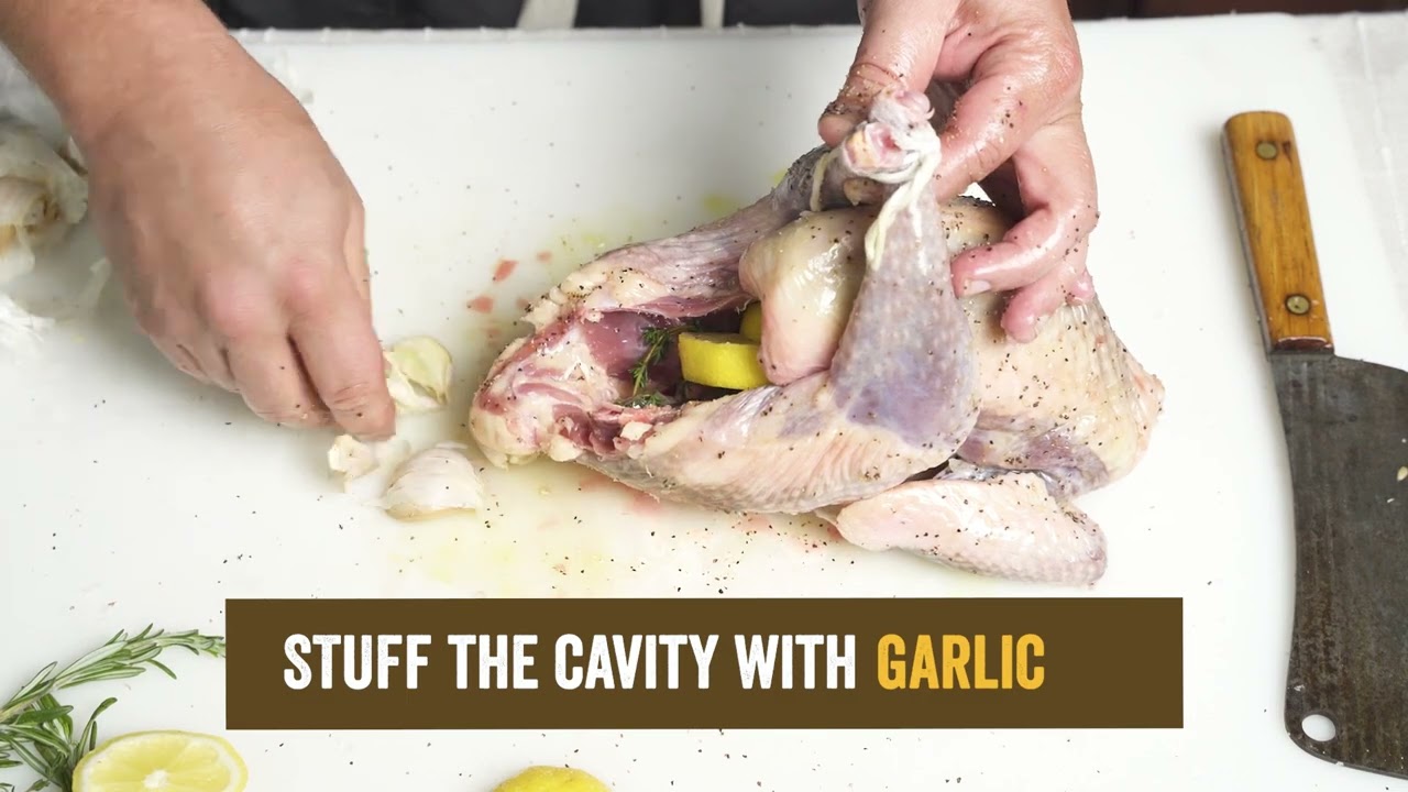2. Season the Pintade with olive oil, herbs, garlic, lemon, salt, and pepper.
