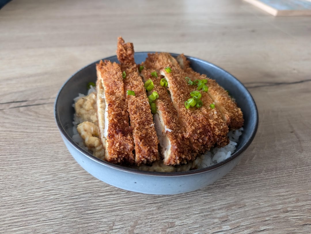 Un fond de riz avec la sauce oignon + dashi + sauce soja + mirin + oeufs et le porc par dessus avec un peu de vert d' oignons nouveaux.